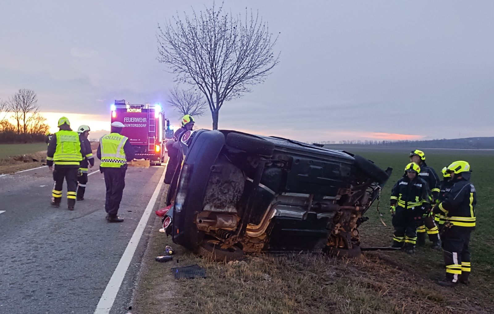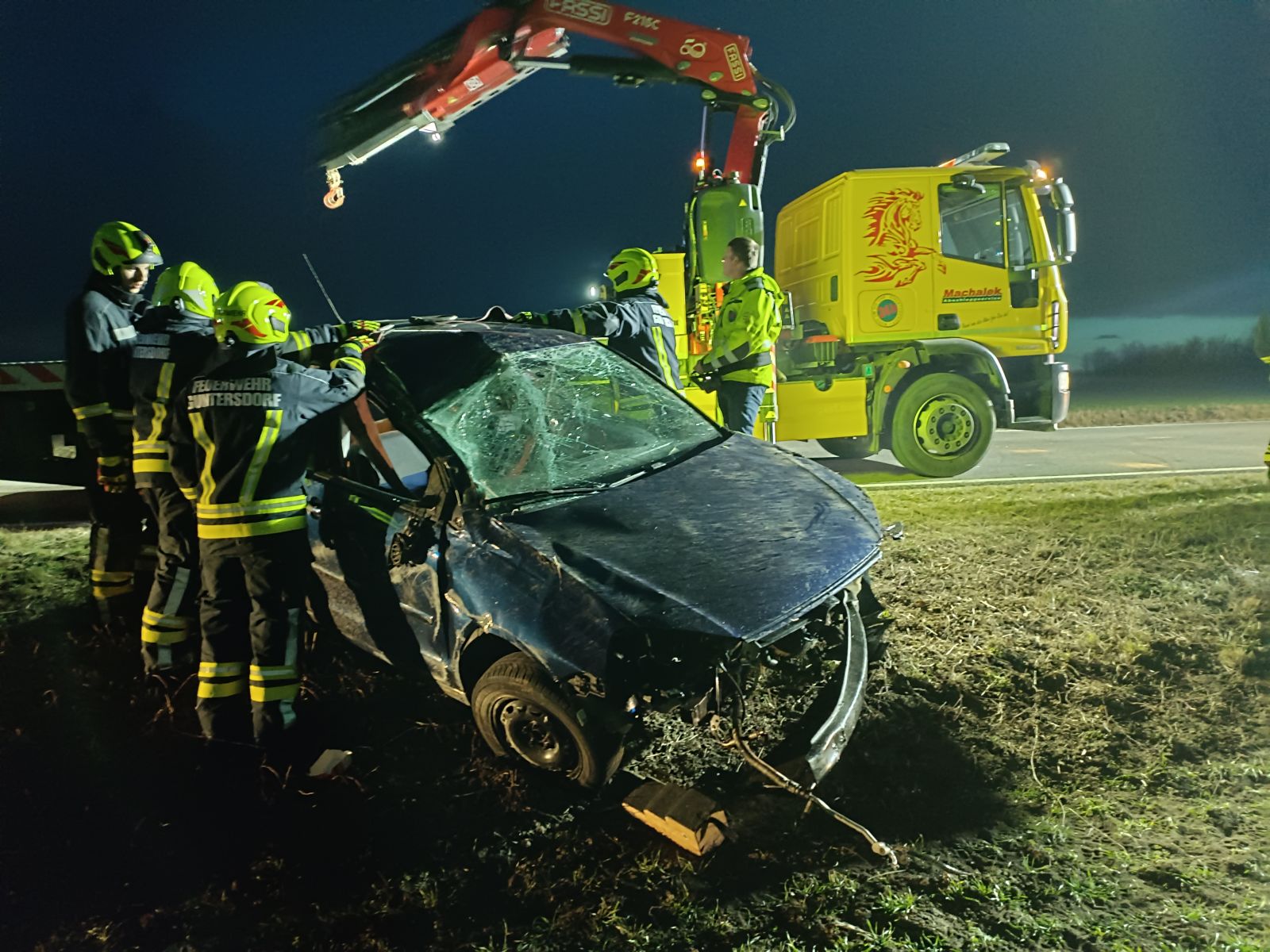 Bei der Erkundung durch den Einsatzleiter stellte sich heraus, dass ein Fahrzeug in Seitenlage im Bankett lag, die Lenkerin befand sich bereits außerhalb. Umgehend wurde die Einsatzstelle abgesichert, der Brandschutz aufgebaut und das Fahrzeug wieder in seine normale Position gebracht. Nachdem die herumliegenden Fahrzeugteile eingesammelt, die Fahrbahn gereinigt und das Unfallfahrzeug durch die Firma Abschleppdienst Machalek verladen und abtransportiert war, konnte die Mannschaft kurz vor 19 Uhr wieder ins Zeughaus einrücken.