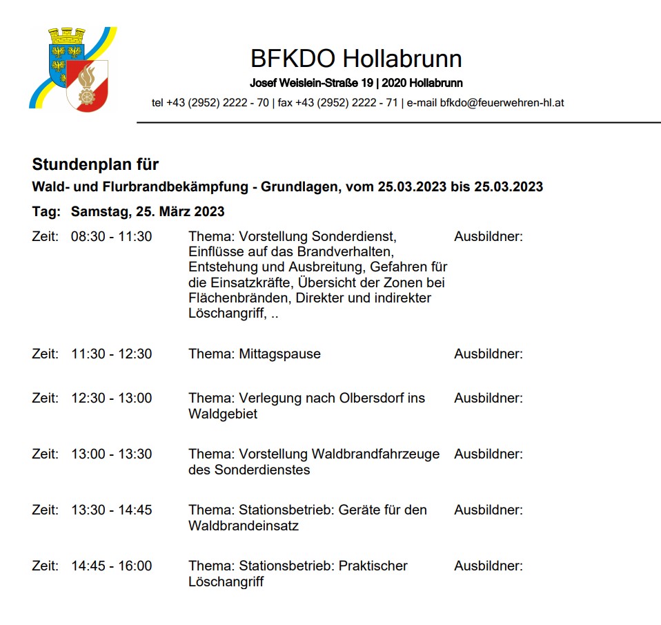 Waldbrandausbildung Restplätze 2023-03-08 Für das Wald- und Flurbrandbekämpfungsmodul am 25.03. bzw. 15.04. sind noch Restplätze frei. Anmeldung über FDISK. 2023-03-08 Waldbrandausbildung