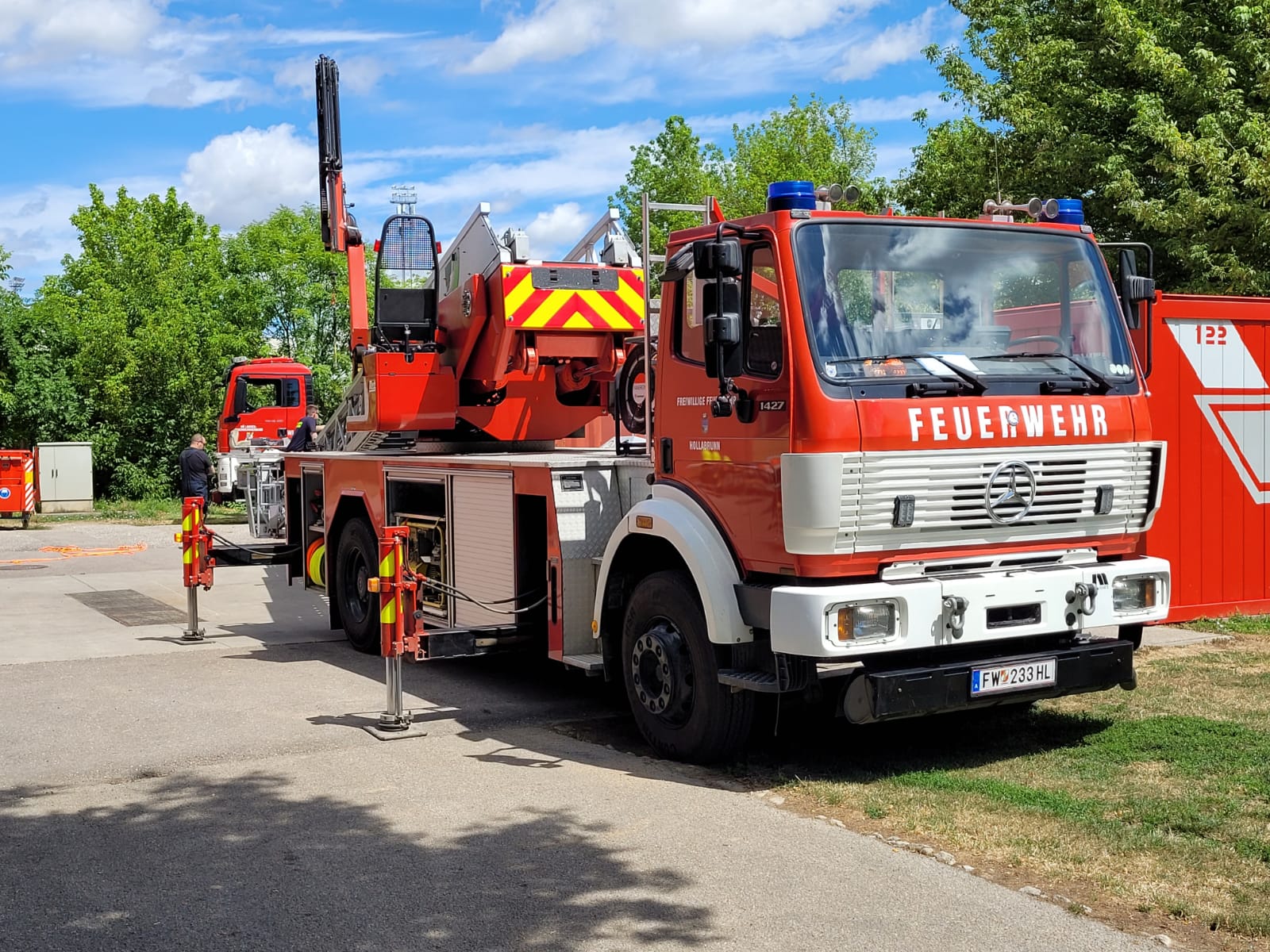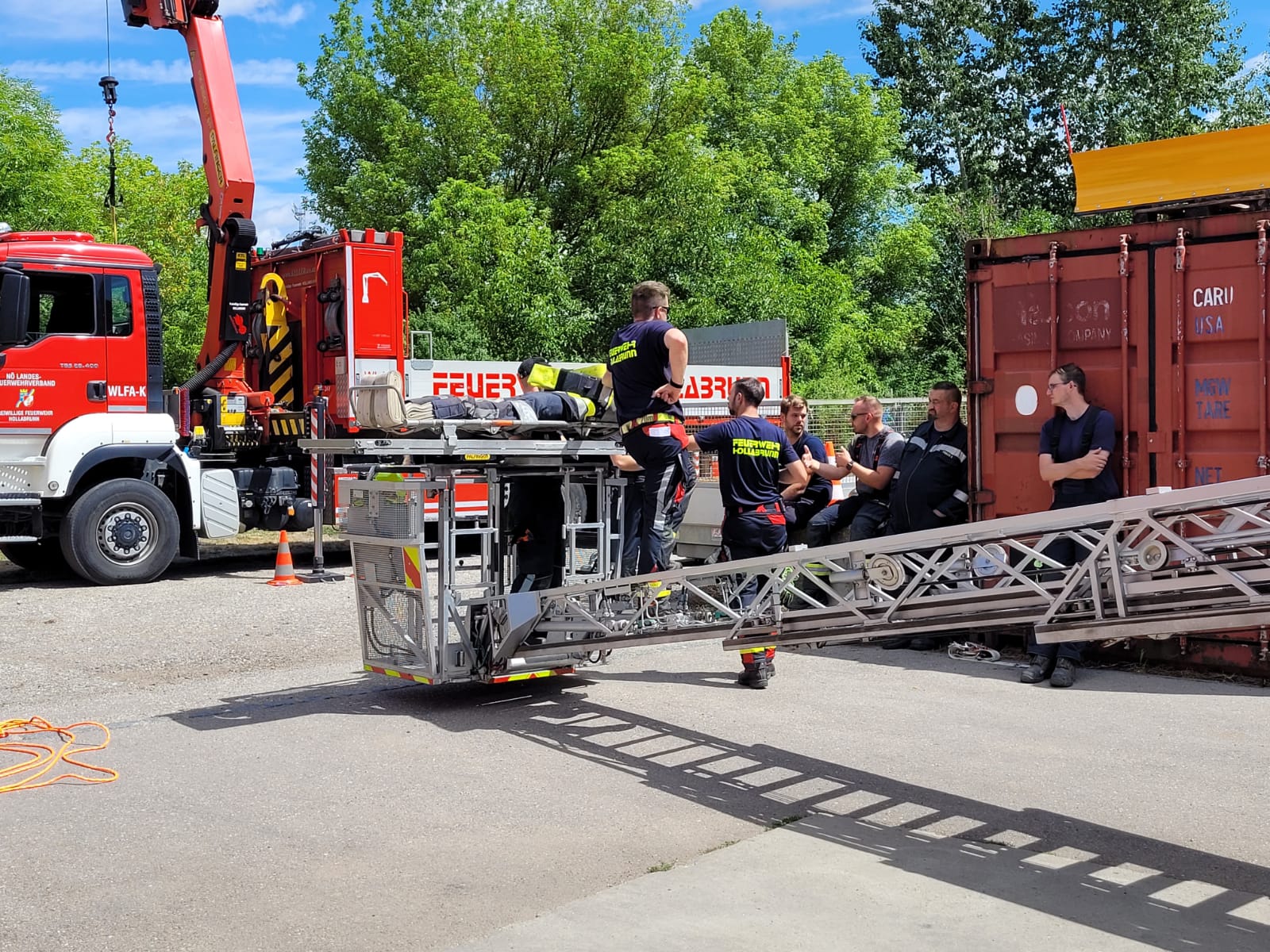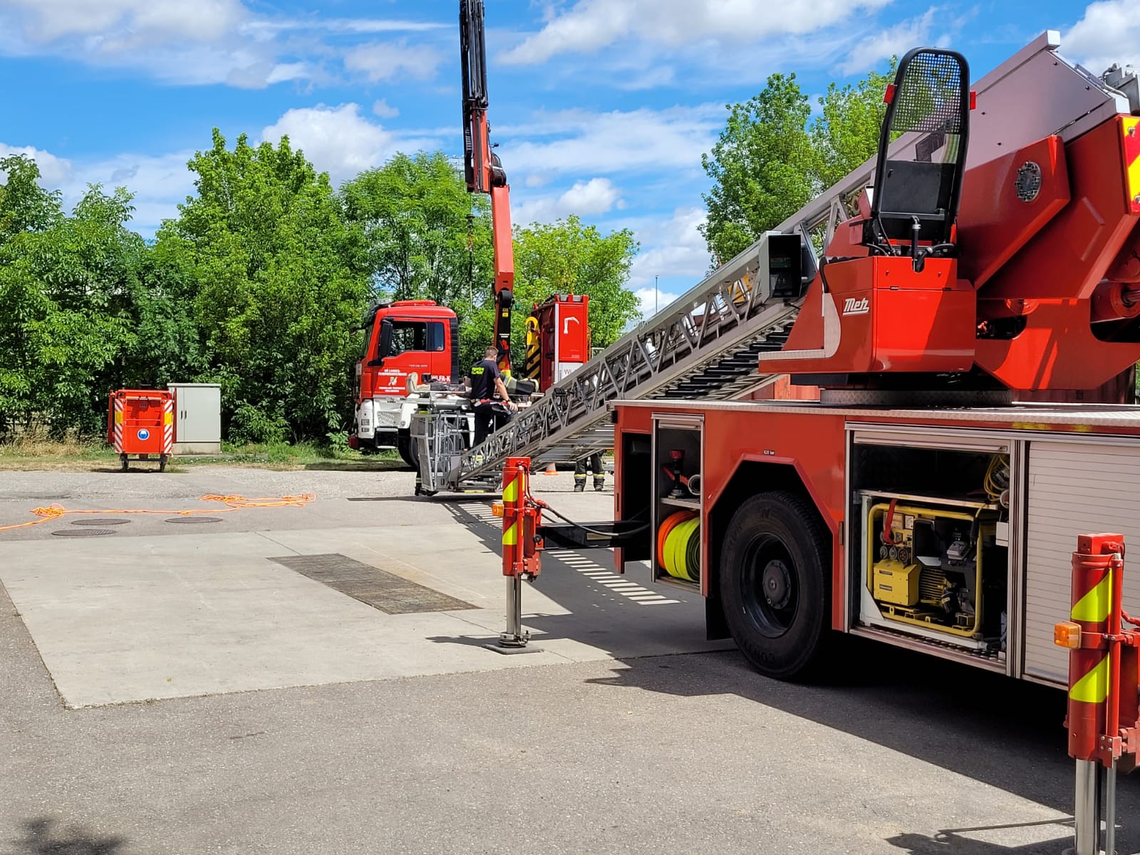 Die Feuerwehrleute erlernten in dieser Station den Einsatz und Umgang mit dem WLFA-K (Wechselladefahrzeug-Kran) und der DLK 23/12 (Drehleiter mit Korb 23/12) bei Menschenrettungen aus großen Höhen. Die Schulung umfasste die Einsatzmöglichkeiten der verschiedenen Geräte und deren vielfältige Anwendungsmöglichkeiten.