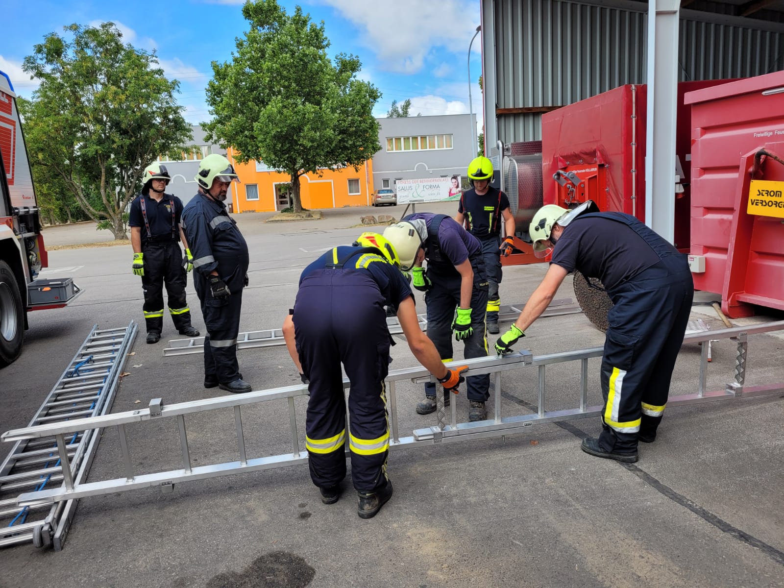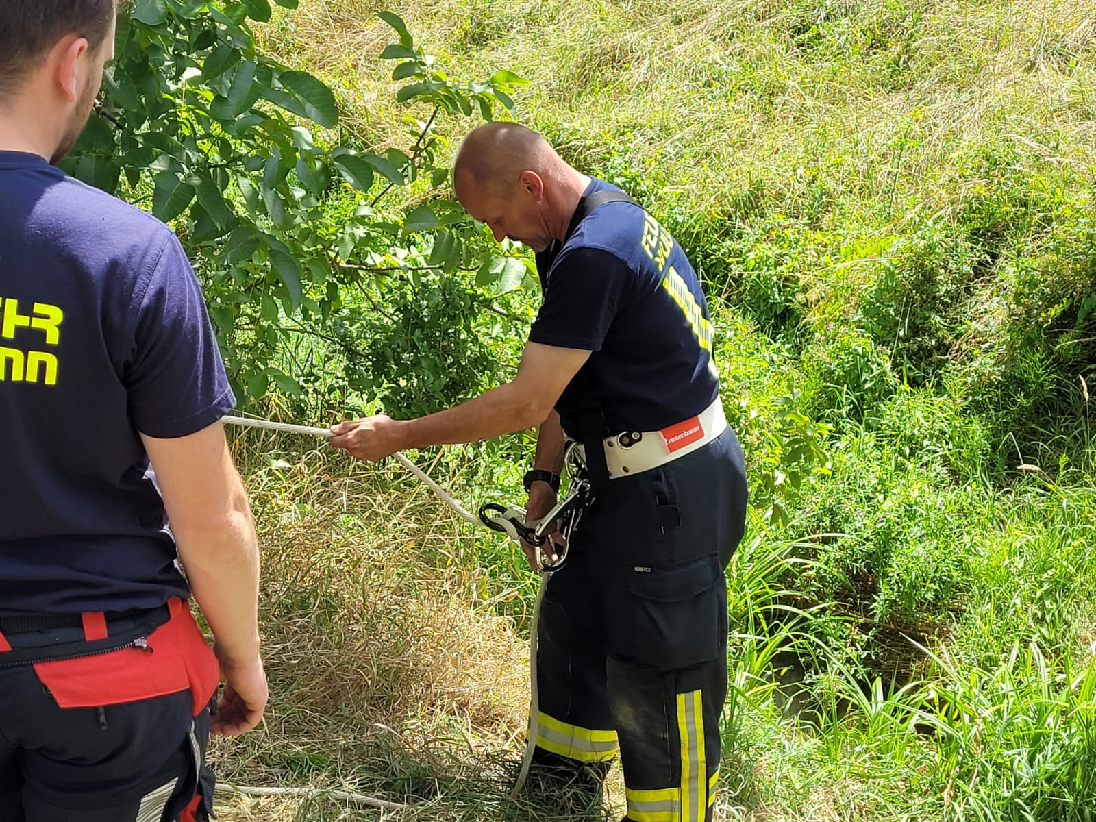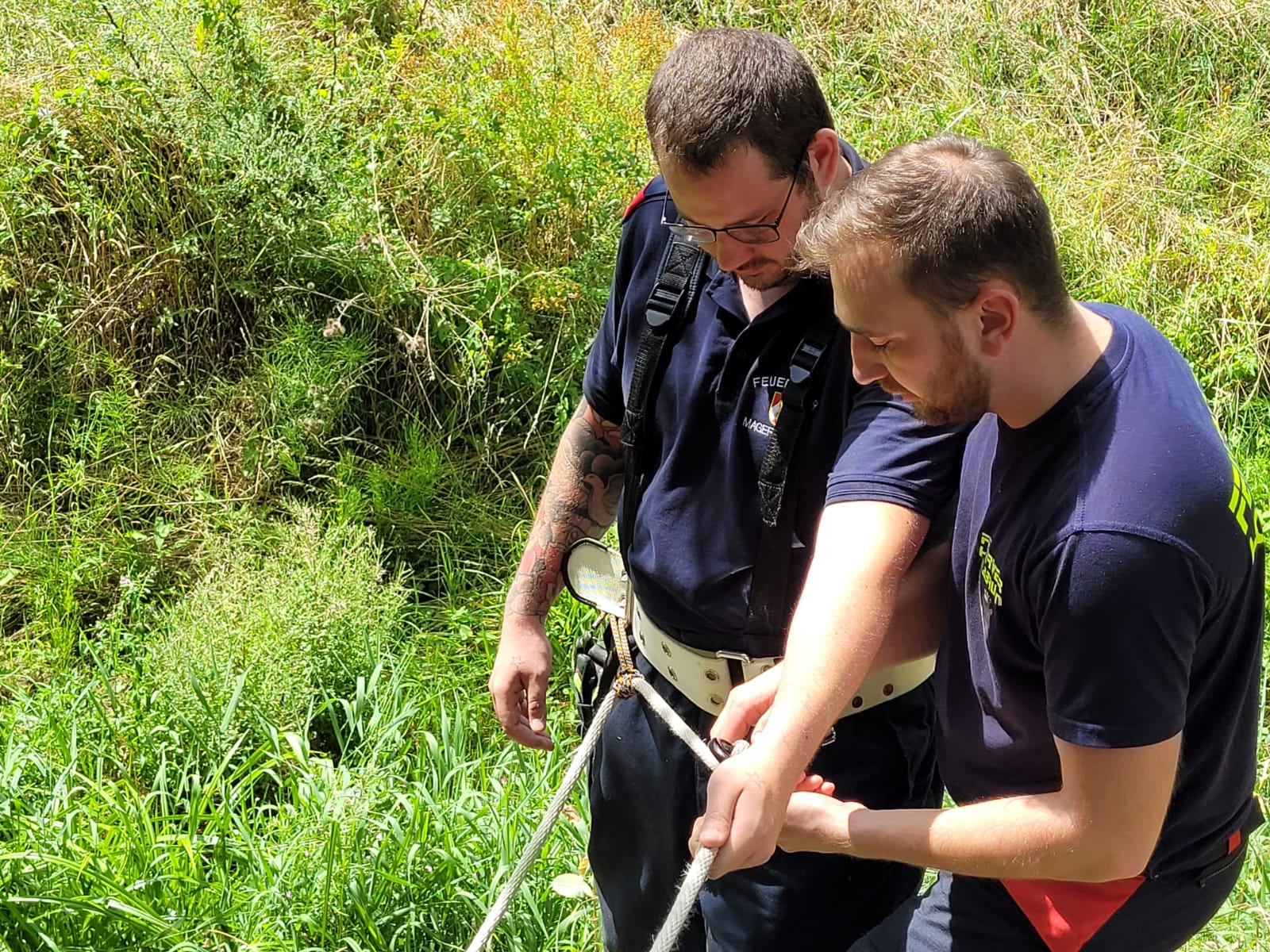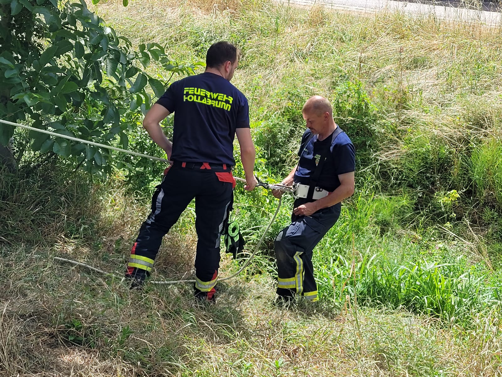 An dieser Station übten die Feuerwehrmänner und -frauen die Rettung einer verletzten Person aus einer schwierigen Hanglage. Dabei wurde der Einsatz einer Korbschleiftrage trainiert, um die verletzte Person schonend und sicher zu bergen. Das Augenmerk lag auf korrekten Seiltechniken und einer reibungslosen Zusammenarbeit im Team.