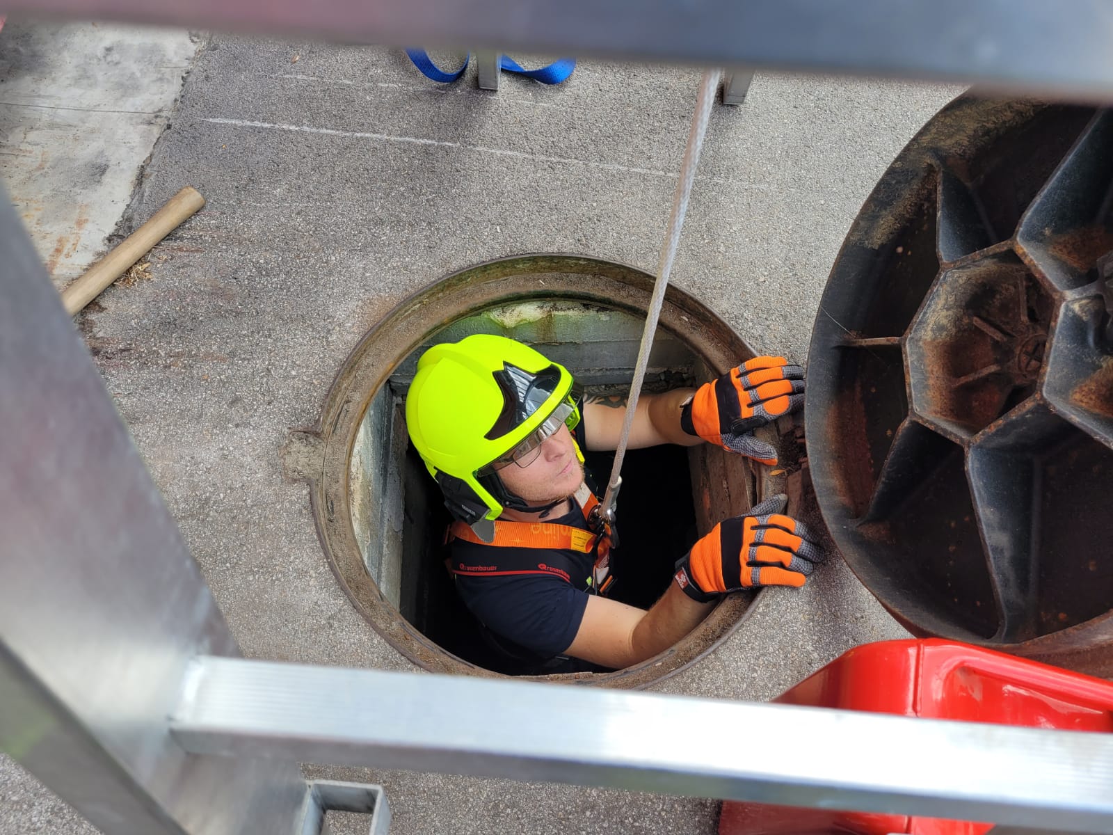 Die Schachtrettung erfordert besondere Fertigkeiten und Ausrüstung. An Station 2 wurden den Teilnehmern verschiedene Schachtrettungsszenarien präsentiert. Mit dem Einsatz der Steckleiter übten die Feuerwehrkräfte die erfolgreiche Rettung von Personen aus der simulierten Schachttiefe.