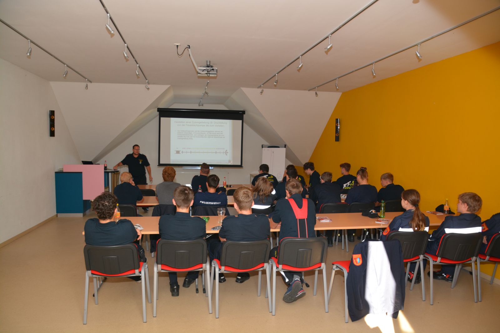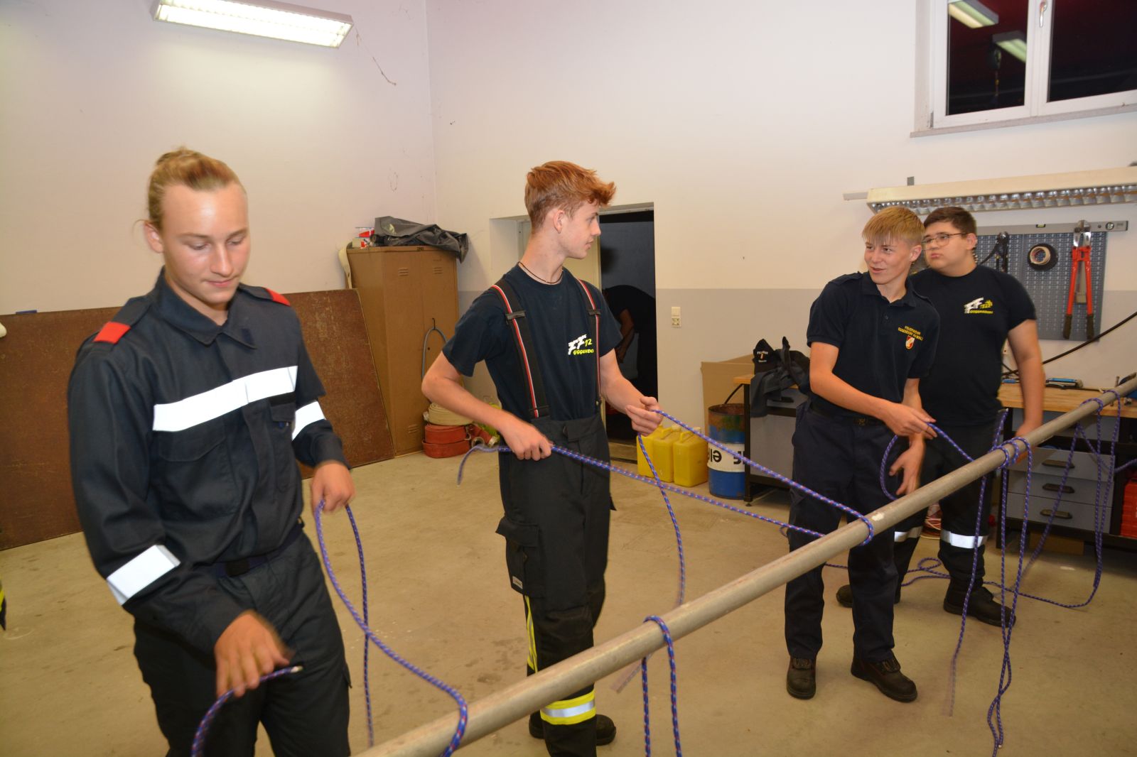 Am ersten Tag standen folgende Themen am Stundenplan *) Gefahren an der Einsatzstelle *) der Feuerwehreinsatz *) die Löschgruppe (Theorie) *) Funk *) Verhalten vor der Gruppe *) Leinen, Knoten und Rettungsmittel *) Kleinlöschgeräte