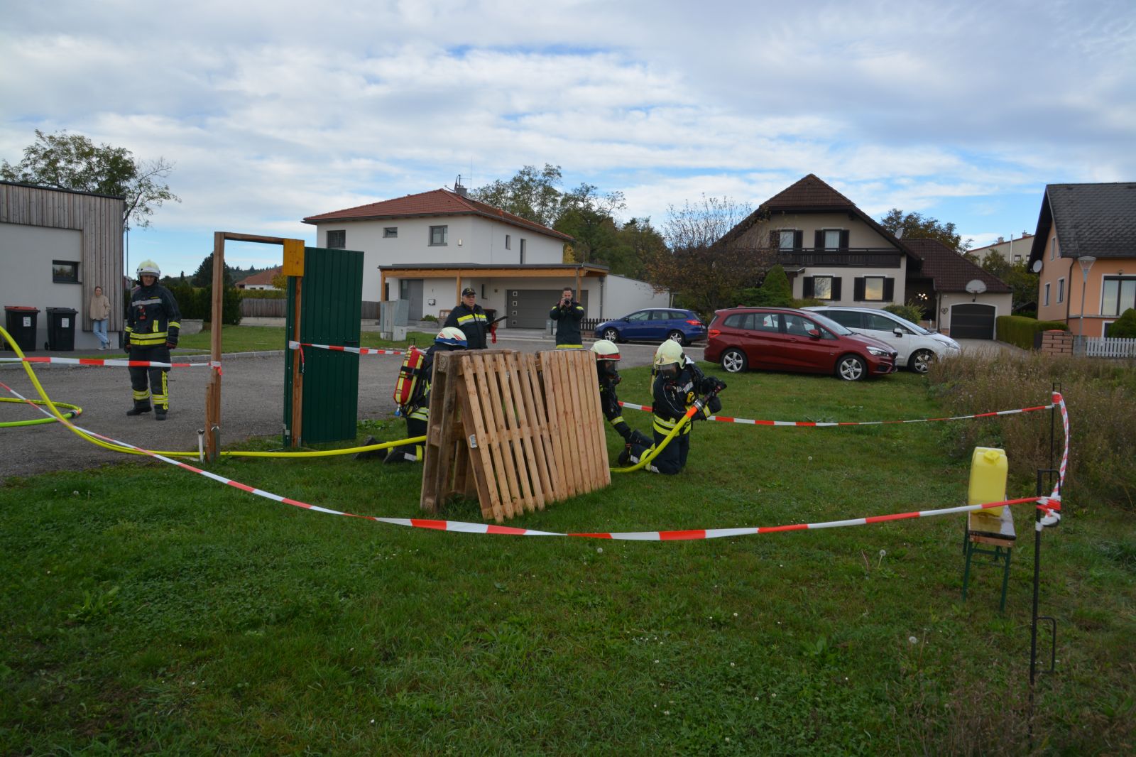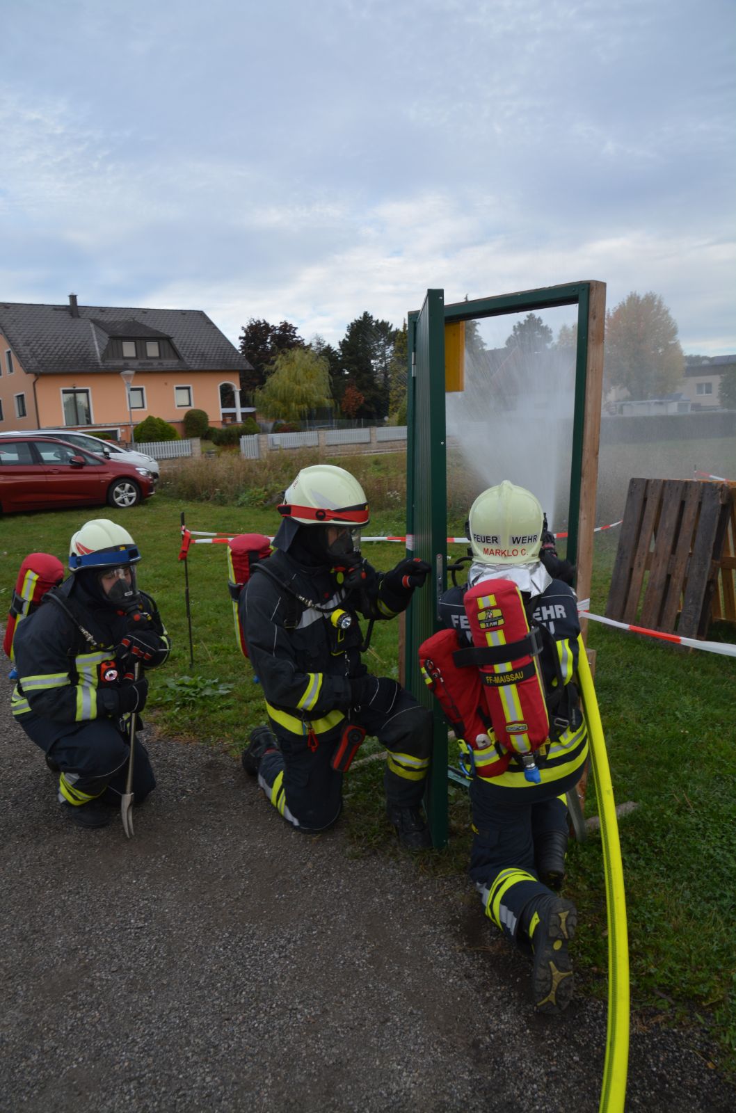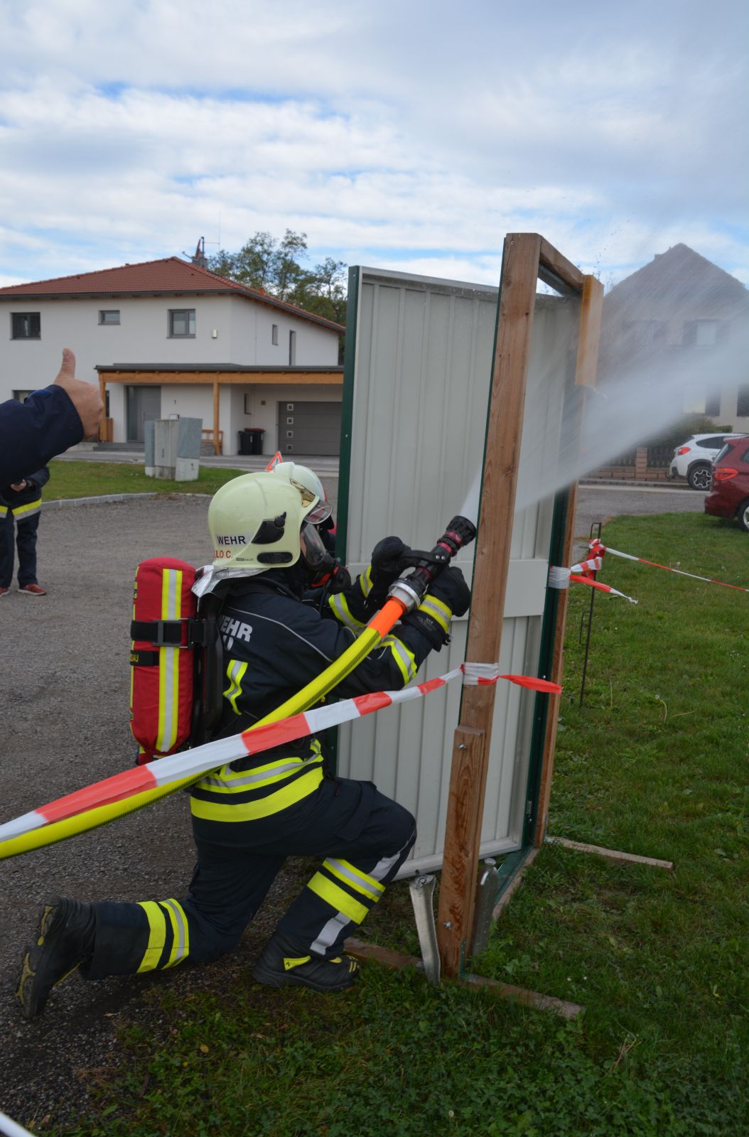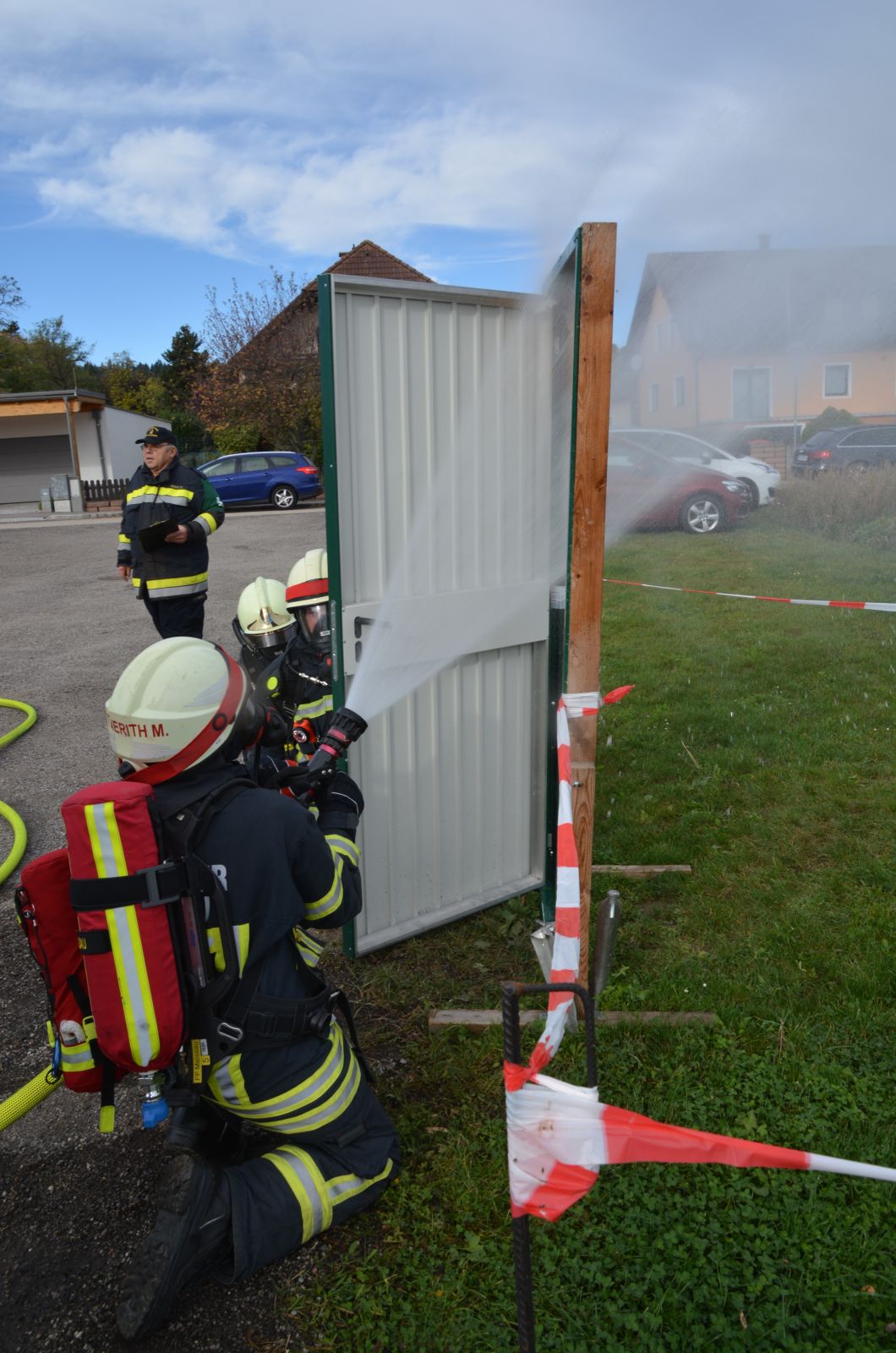 Im praktischen Teil musste ein simulierter Zimmerbrand gelöscht werden. Dabei musste der Innenangriff mit Atemschutz in einer vorgegebenen Zeit absolviert werden.