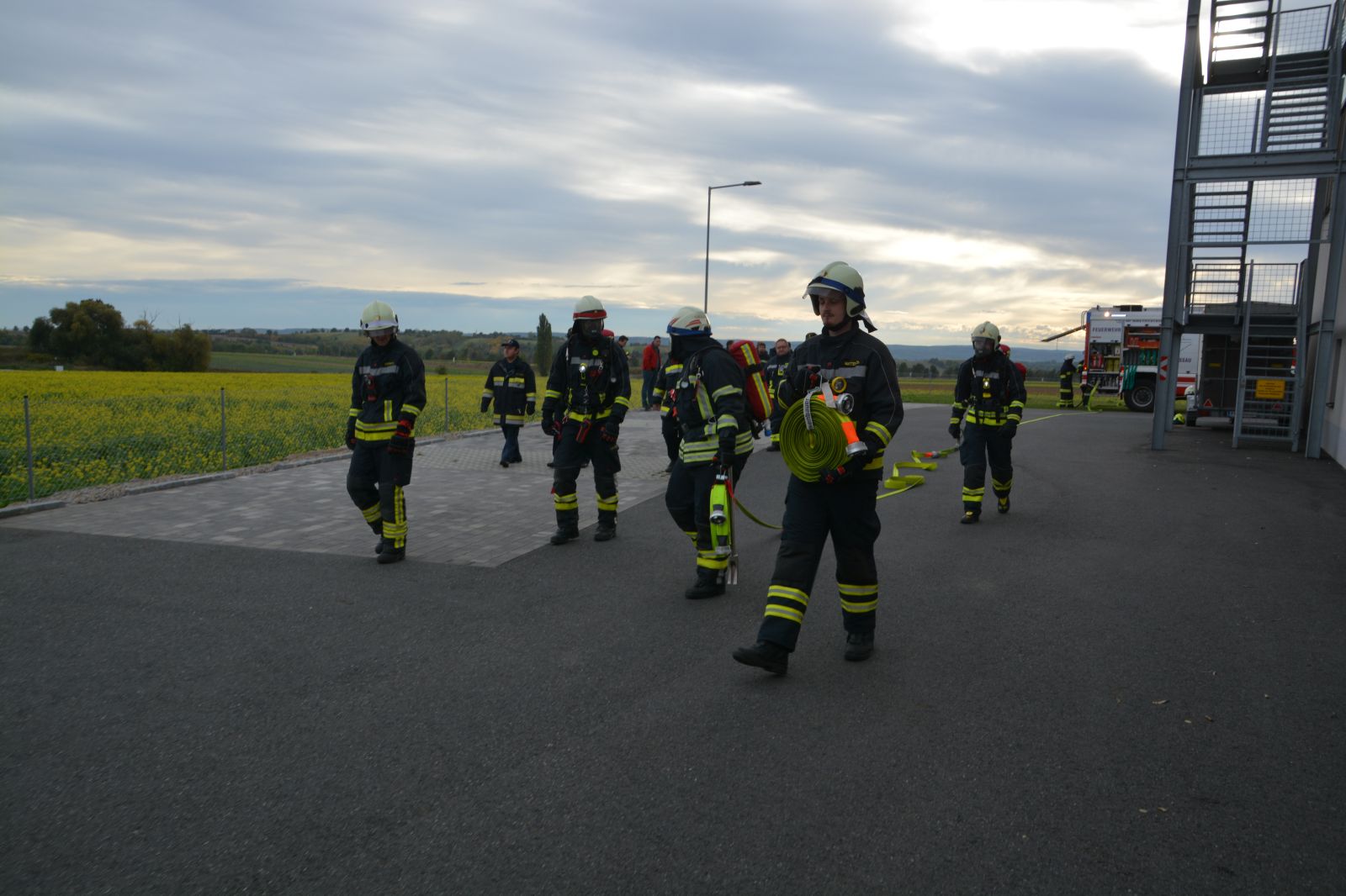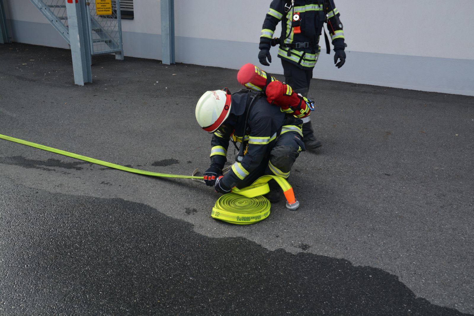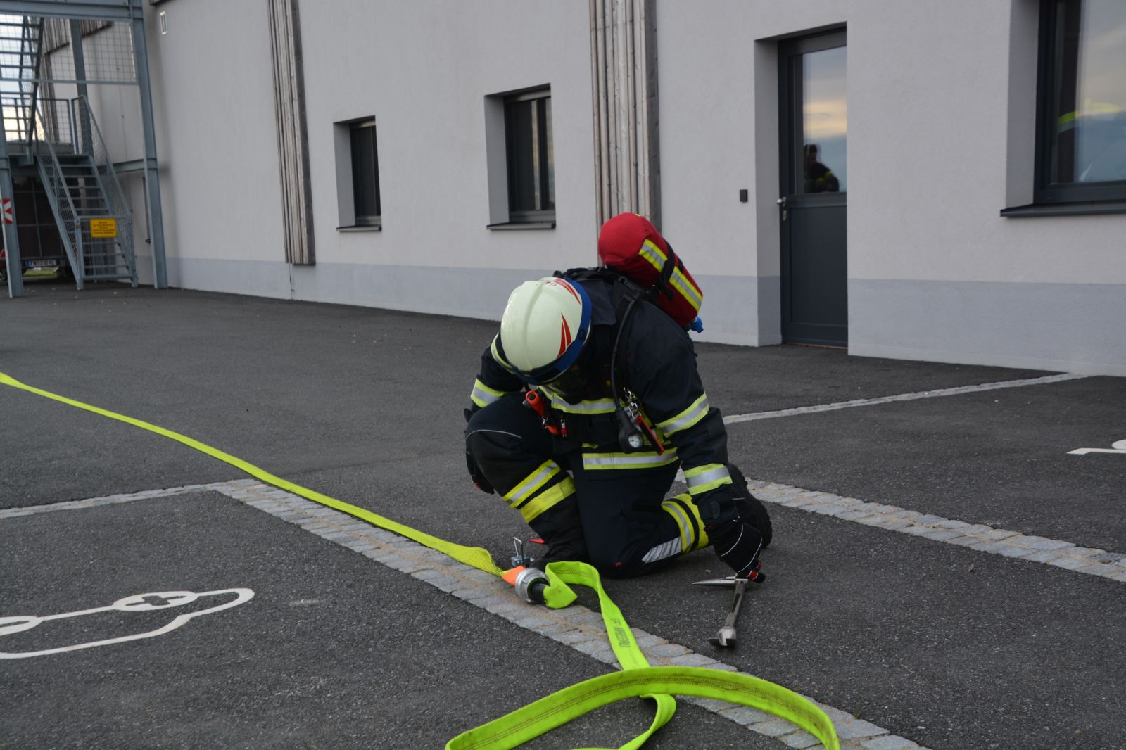 Im praktischen Teil musste ein simulierter Zimmerbrand gelöscht werden. Dabei musste der Innenangriff mit Atemschutz in einer vorgegebenen Zeit absolviert werden.