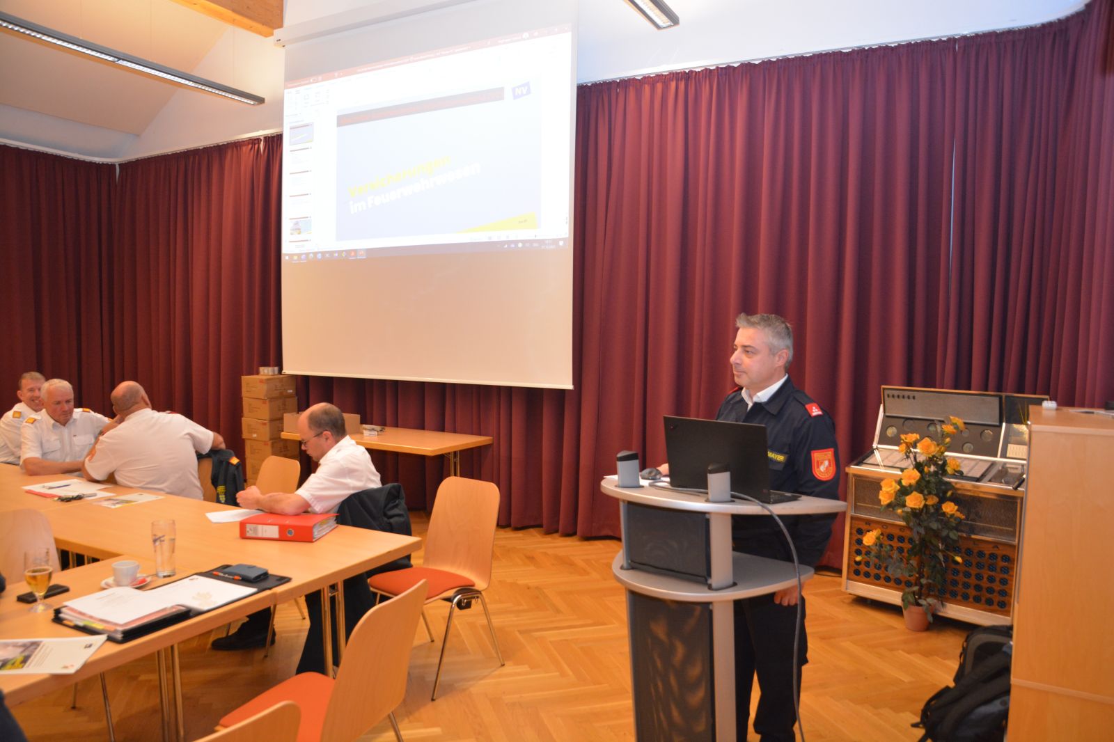 Danach gab es einen Vortrag von HLM Helmut Engelmayer (FF Rohrbach) zum Thema „Versicherung in der Feuerwehr“. Er zeigte auf, welche Versicherungen gab es für die Feuerwehr und was ist alles damit versichert bzw. was versichern die Gemeinden.