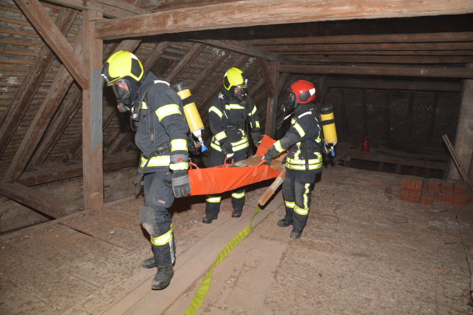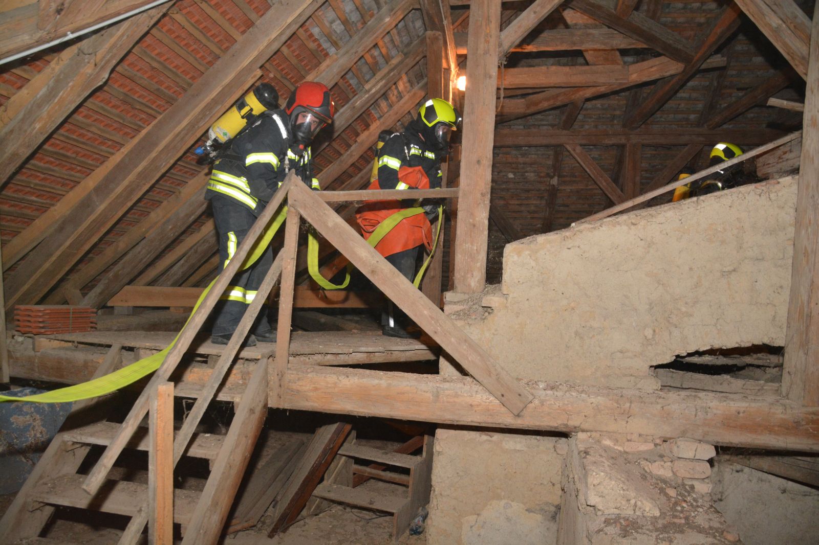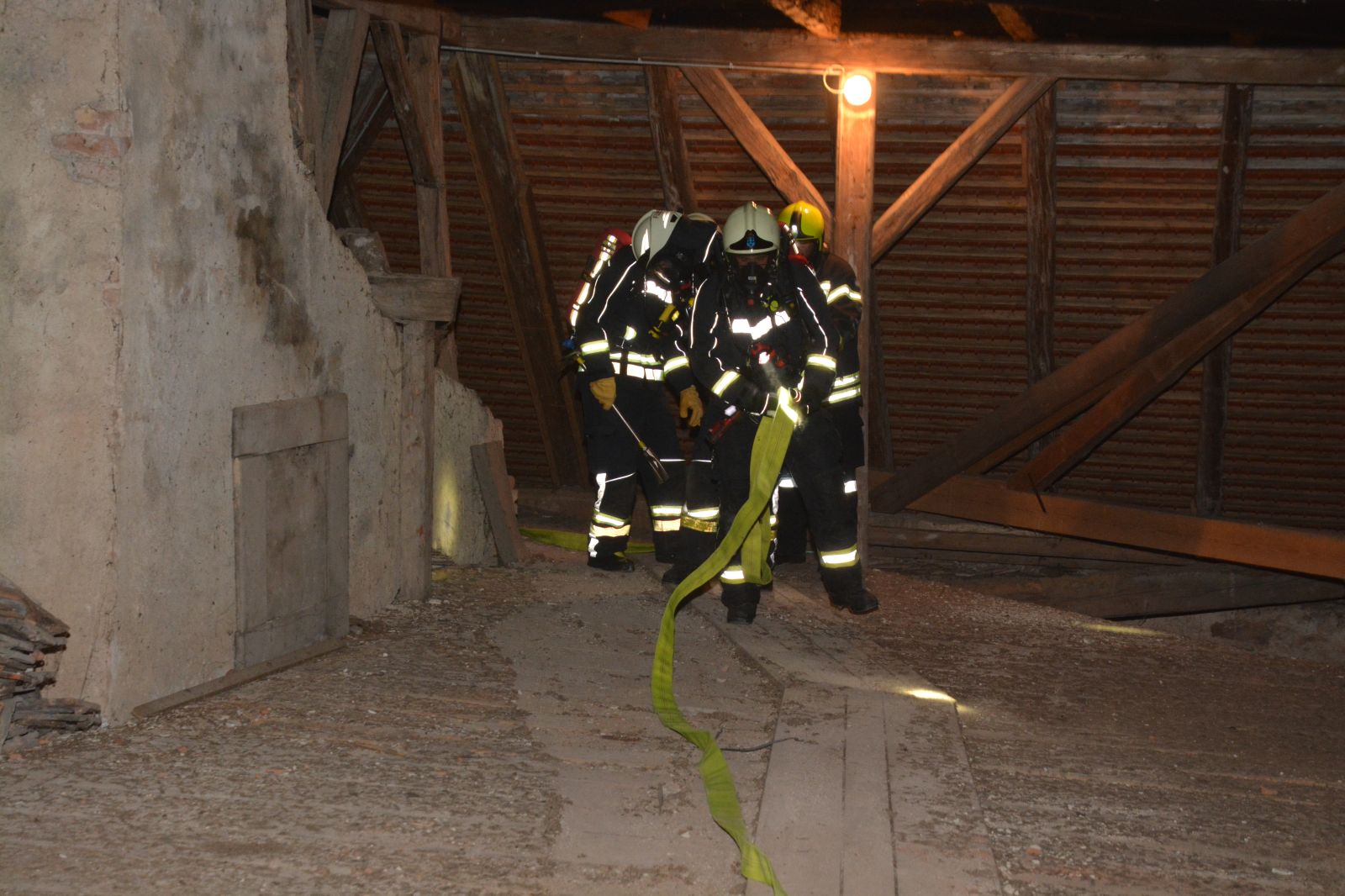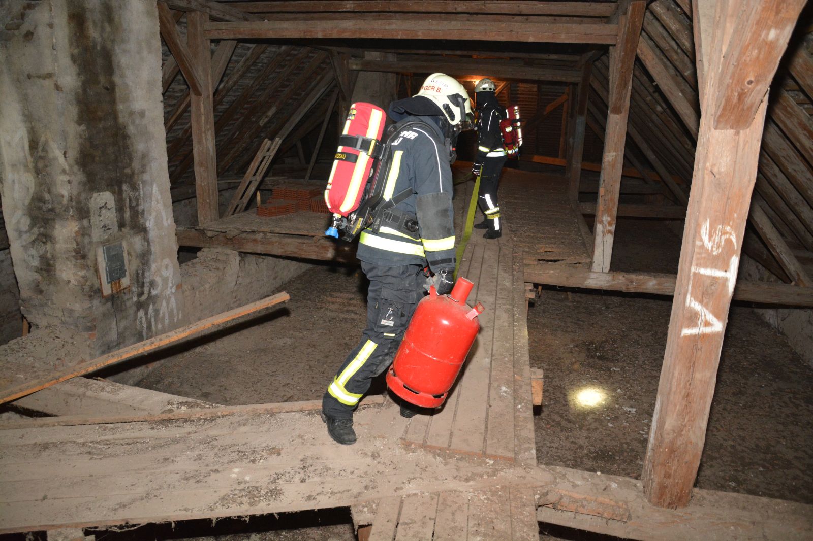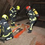 Erstes Szenario war eine Verpuffung bei Arbeiten am Dachboden, welche zu einem Dachstuhlbrand führte. Dabei wurde eine Person vermisst.