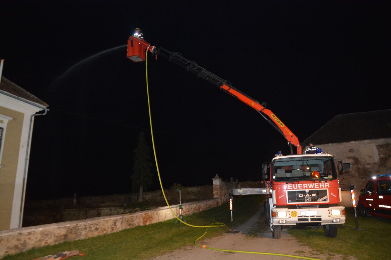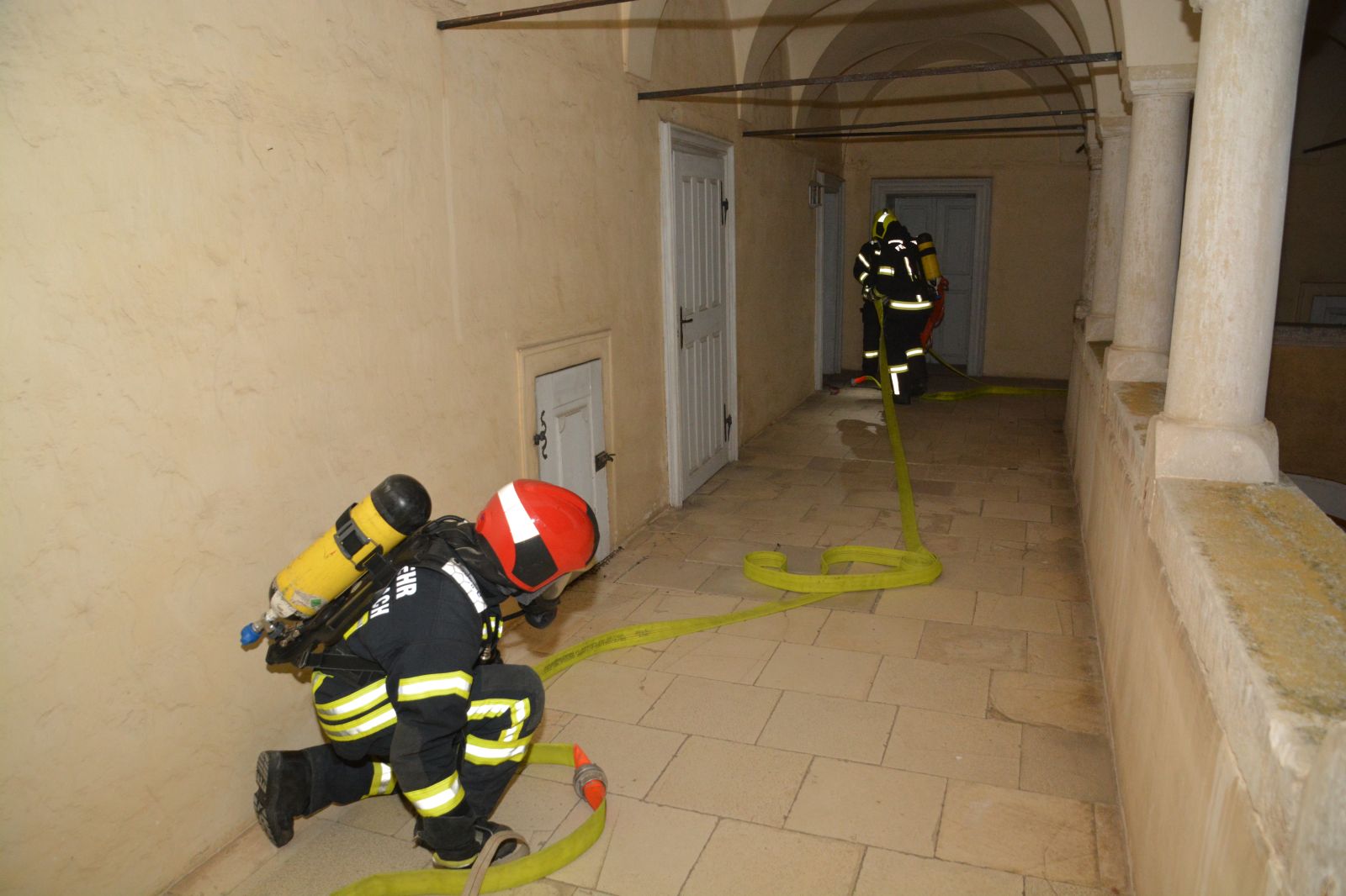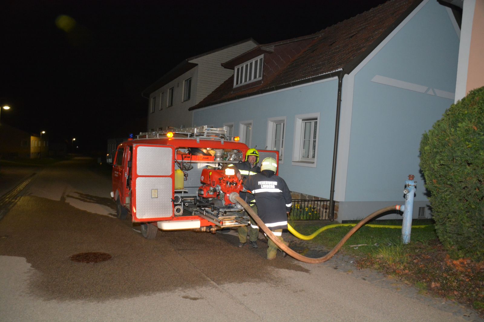 Erstes Szenario war eine Verpuffung bei Arbeiten am Dachboden, welche zu einem Dachstuhlbrand führte. Dabei wurde eine Person vermisst.