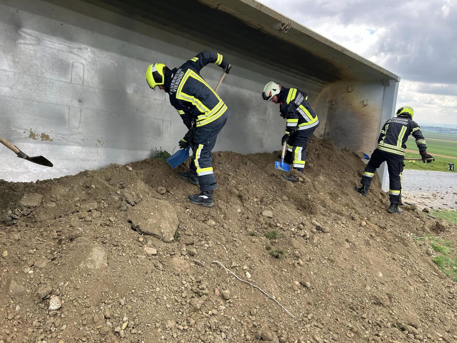 Zuerst wurde die geladene Erde abgeschaufelt, die Mulde mittels Hebekissen der zusätzlich alarmierten Feuerwehr Großstelzendorf leicht angehoben, gesichert und dann das Sattelgespann mittels Seilwinden der Feuerwehren Viendorf und Göllersdorf aufgerichtet.