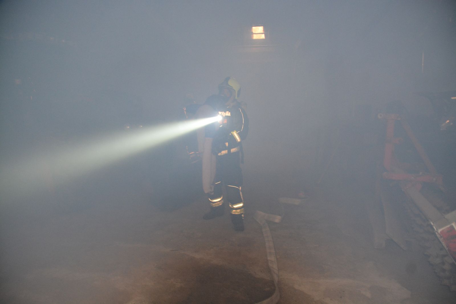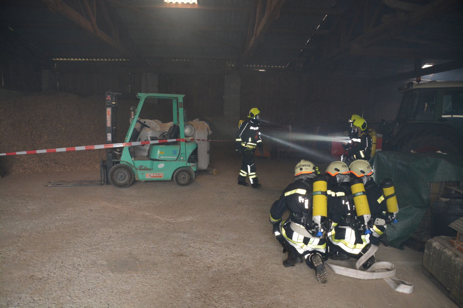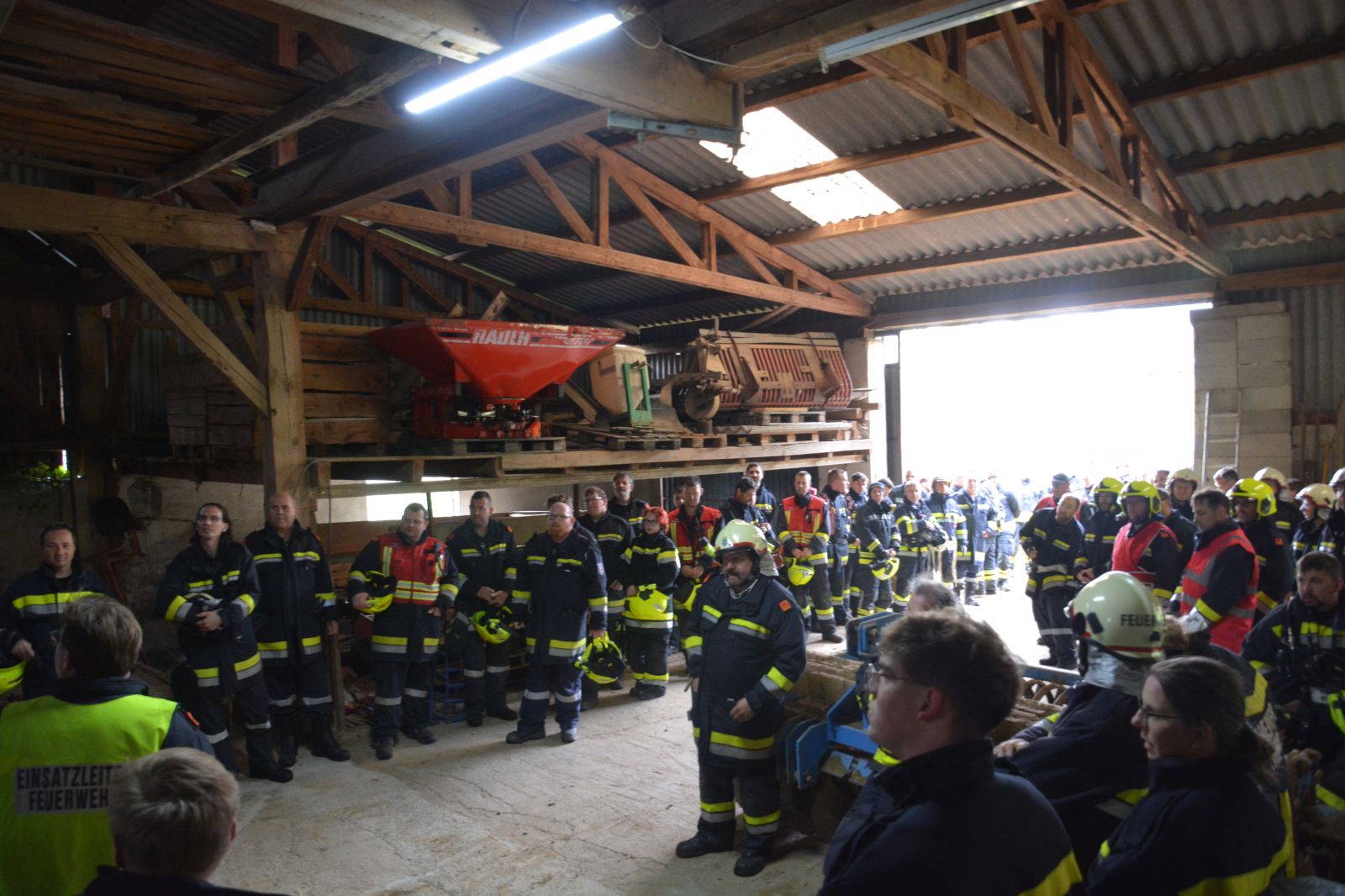 Übungsannahme war ein Brand in einer Landwirtschaftlichen Halle mit 3 vermissten Personen. In der Halle waren Maschinen und Geräte, Kunstdünger und Hackschnetzel gelagert. Auch ein Gas-Stapler war in der Halle abgestellt.