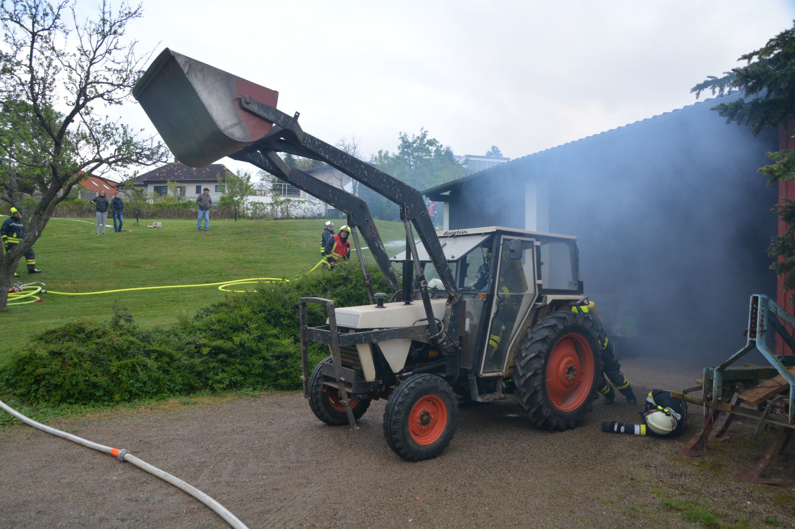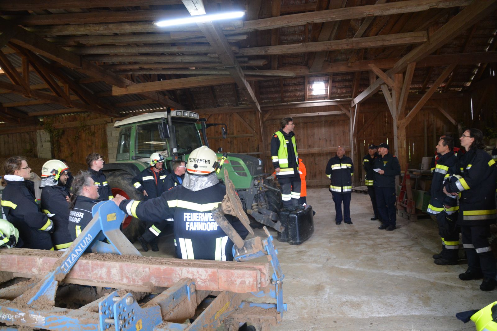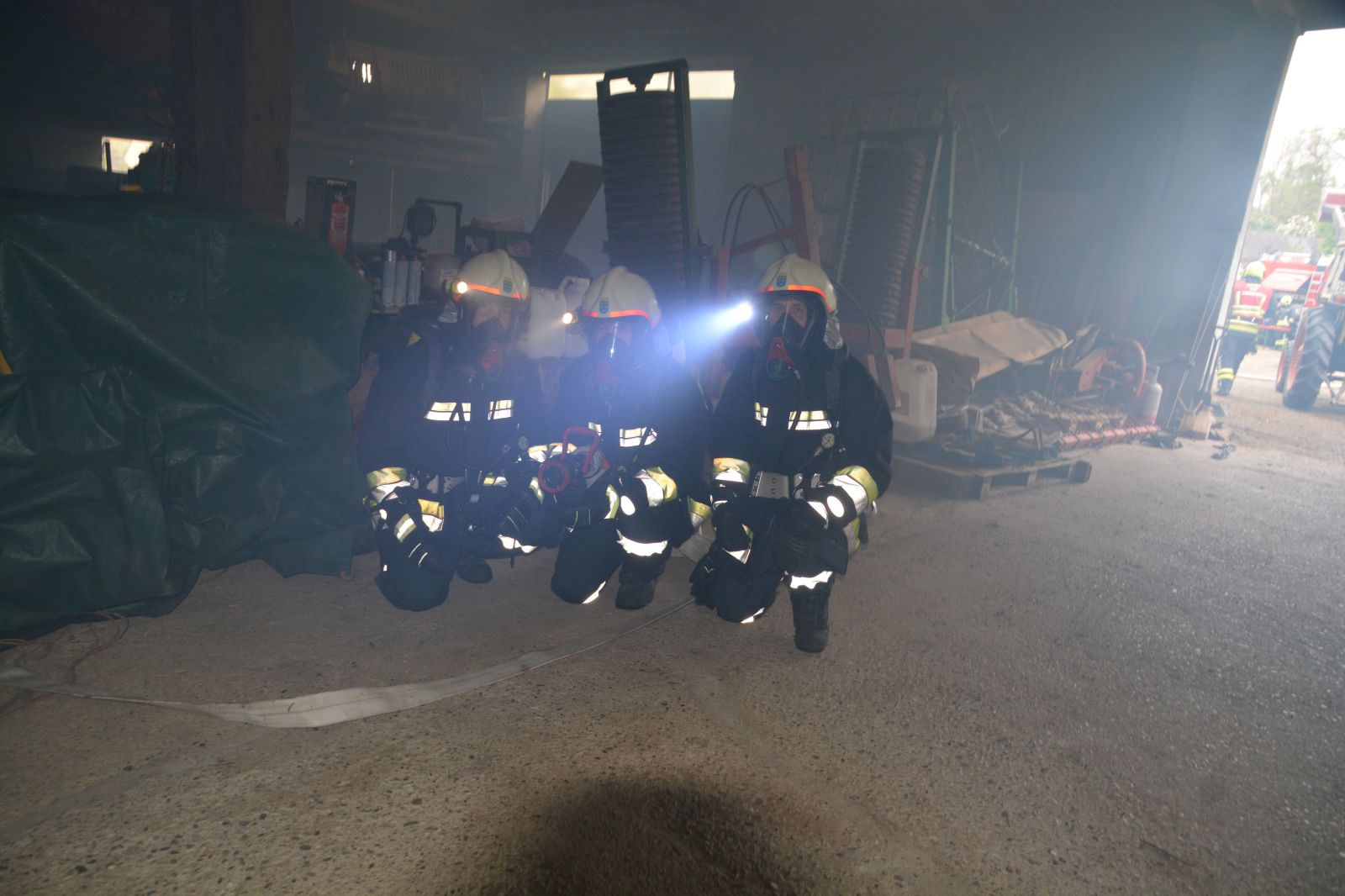 Übungsannahme war ein Brand in einer Landwirtschaftlichen Halle mit 3 vermissten Personen. In der Halle waren Maschinen und Geräte, Kunstdünger und Hackschnetzel gelagert. Auch ein Gas-Stapler war in der Halle abgestellt.
