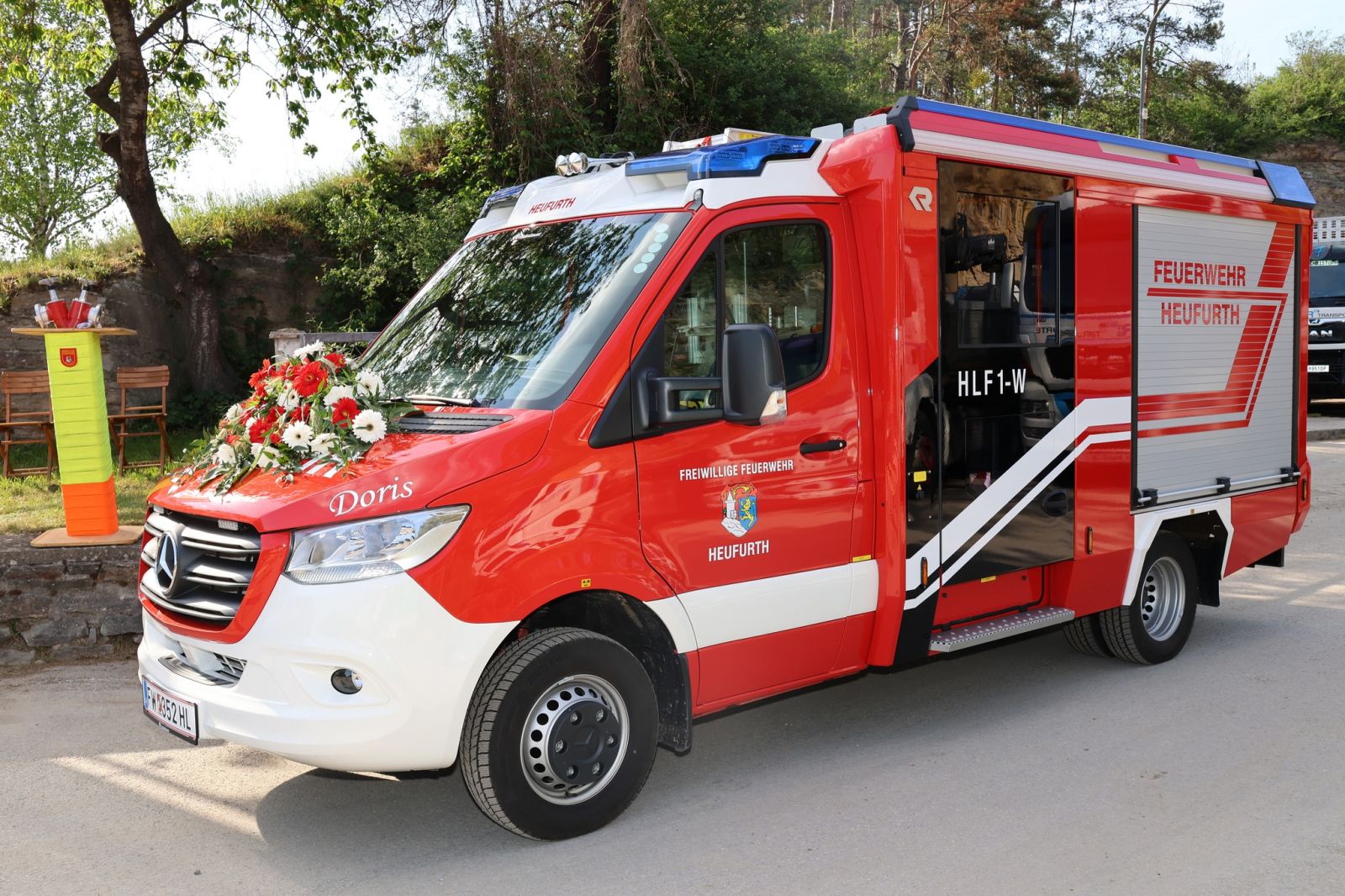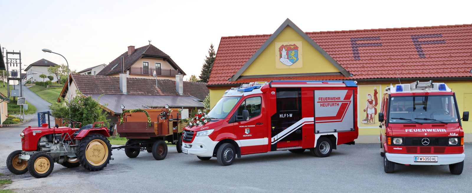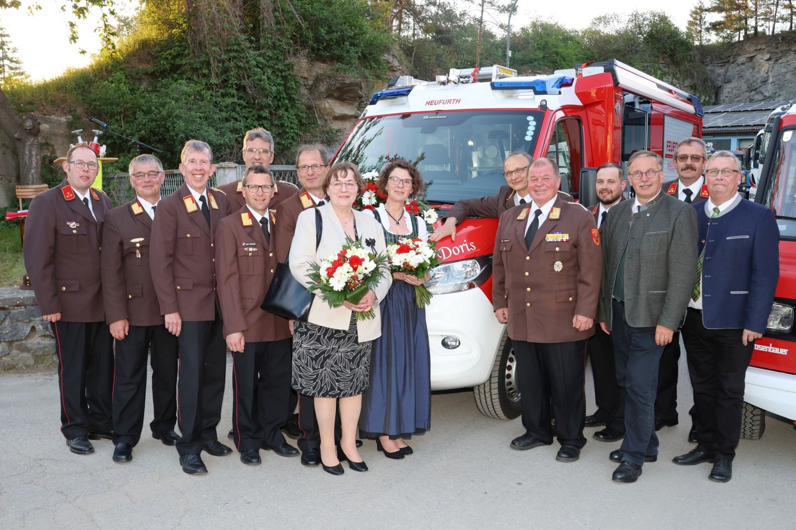 Zur Patin des neuen Feuerwehrautos HLF1 W durften wir Doris Orasch, geb. Sackl, ernennen. Bereits ihre Großmutter, Anna Mann, war Patin des ersten Rüstwagens in den 1950er Jahren. Standesgemäß wurden die beiden Fahrzeugpatinen Doris sowie Maria, Patin unseres ersten Feuerwehrautos, begleitet von ihrem Gatten Franz Setzer durch unser Kommando, mit dem Rüstwagen, der von 1971-1994 im Dienste der FF Heufurth stand, abgeholt.