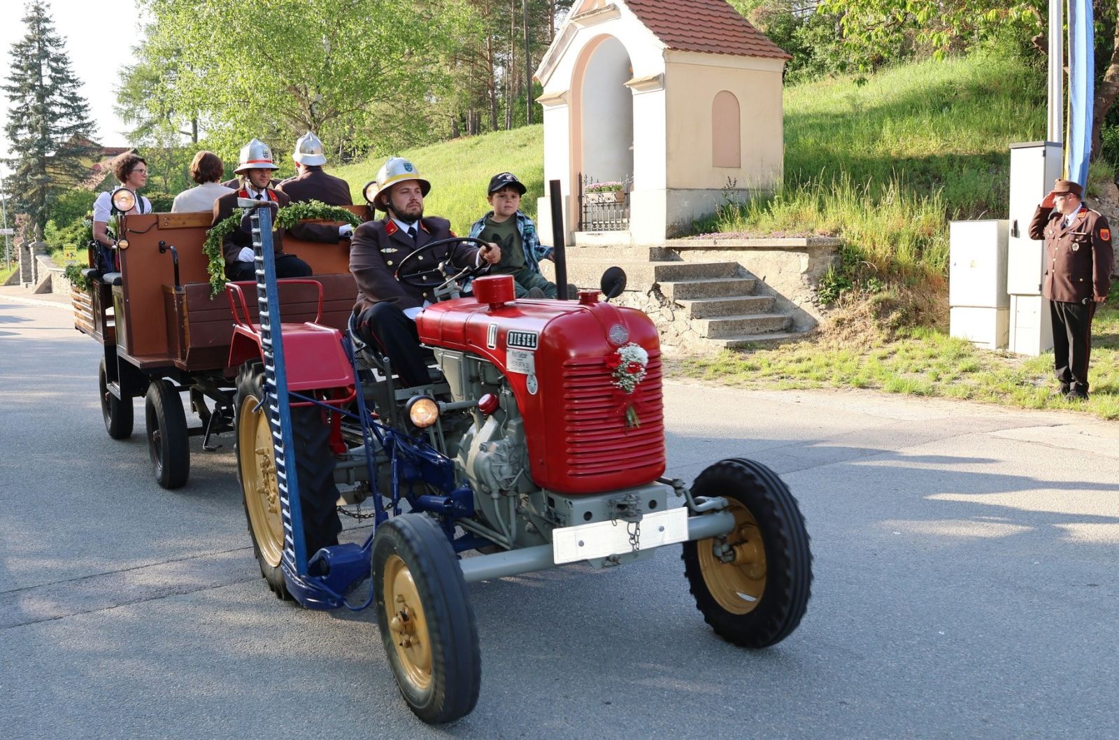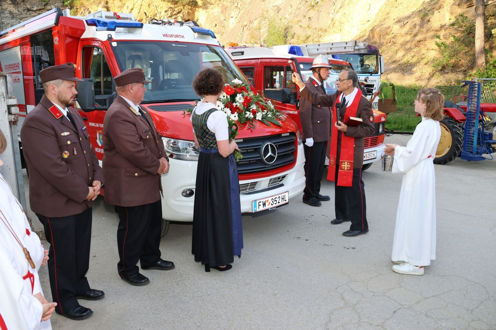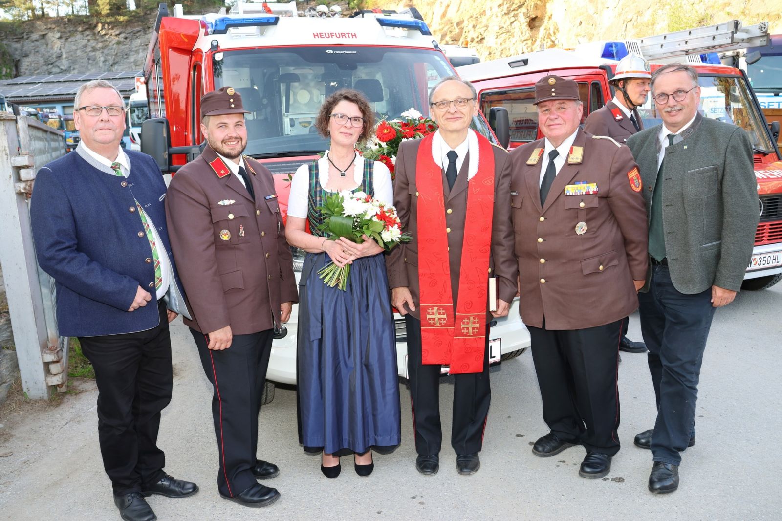 Zur Patin des neuen Feuerwehrautos HLF1 W durften wir Doris Orasch, geb. Sackl, ernennen. Bereits ihre Großmutter, Anna Mann, war Patin des ersten Rüstwagens in den 1950er Jahren. Standesgemäß wurden die beiden Fahrzeugpatinen Doris sowie Maria, Patin unseres ersten Feuerwehrautos, begleitet von ihrem Gatten Franz Setzer durch unser Kommando, mit dem Rüstwagen, der von 1971-1994 im Dienste der FF Heufurth stand, abgeholt.