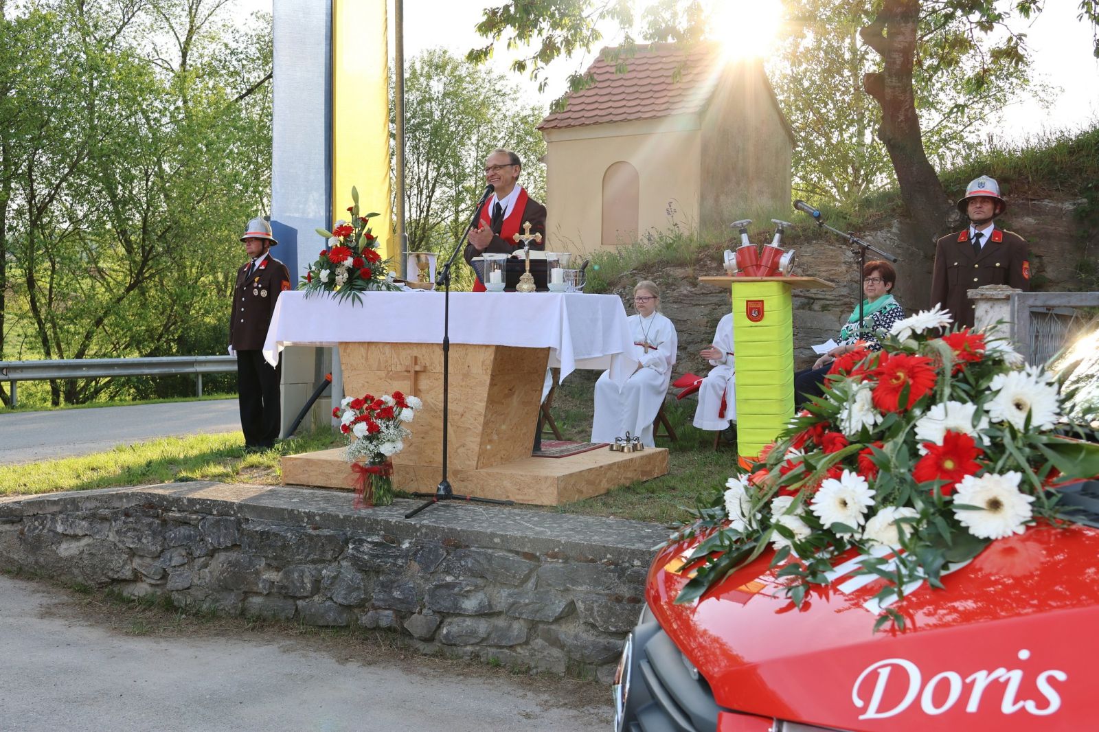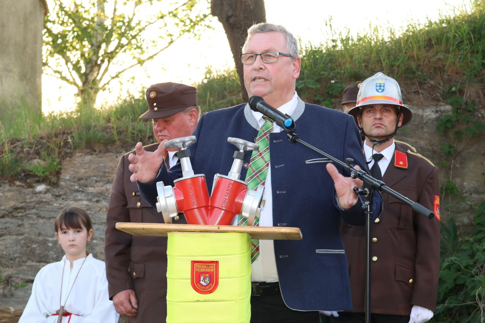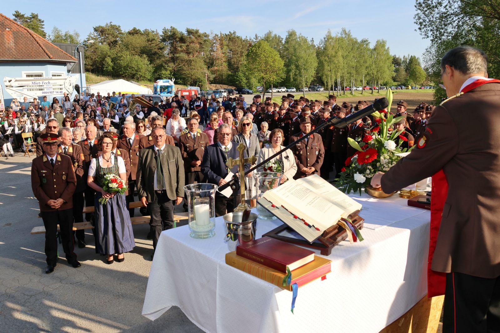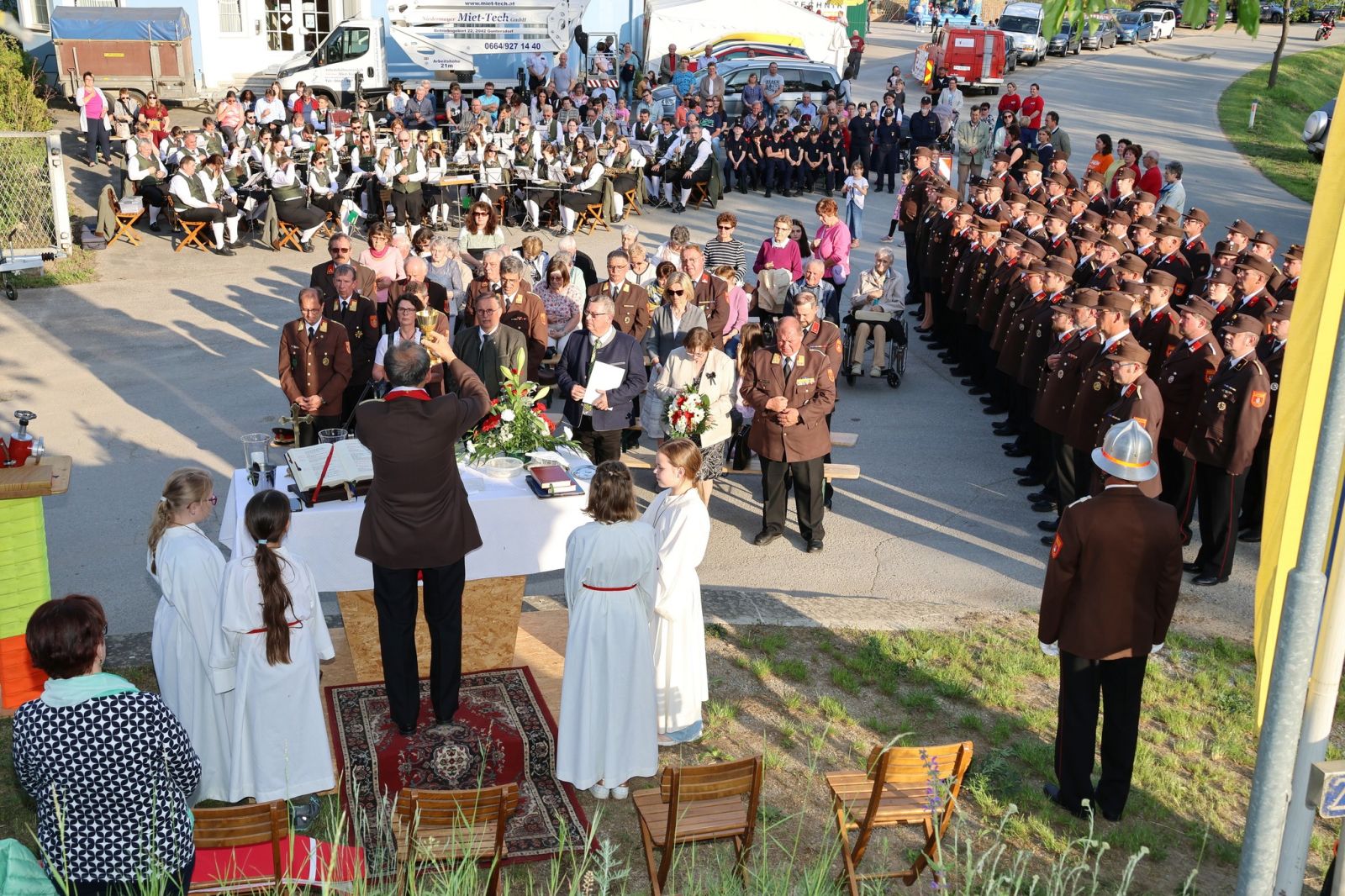 Am Samstag, 4. Mai 2024, begann unser Feuerwehrfest mit einem geselligen Nachmittag bei der Muttertagsfeier der Stadtgemeinde Hardegg. Umrahmt wurde dieser mit musikalischen Beiträgen der Volkschulkinder aus Pleissing sowie den Schülerinnen und Schülern der Musikschule. Anschließend sorgte die Musikgruppe Twopack für Unterhaltung. Zur Florianimesse und Fahrzeugsegnung durften wir zahlreiche Feuerwehrkameradinnen und Feuerwehrkameraden aus der Stadtgemeinde Hardegg, sowie dem Bezirk Hollabrunn, begrüßen. Bei herrlichem Wetter zelebrierte Feuerwehrkurrat Stanislaw Milczanowski feierlich die Florianimesse. Im Anschluss begrüßten Kommandant Reinhard Scheichenberger und die Kommandantstellvertreter Alexander Brand-Hochrainer und Thomas Stiepani die anwesenden Besucherinnen und Besucher sowie die Ehrengäste.