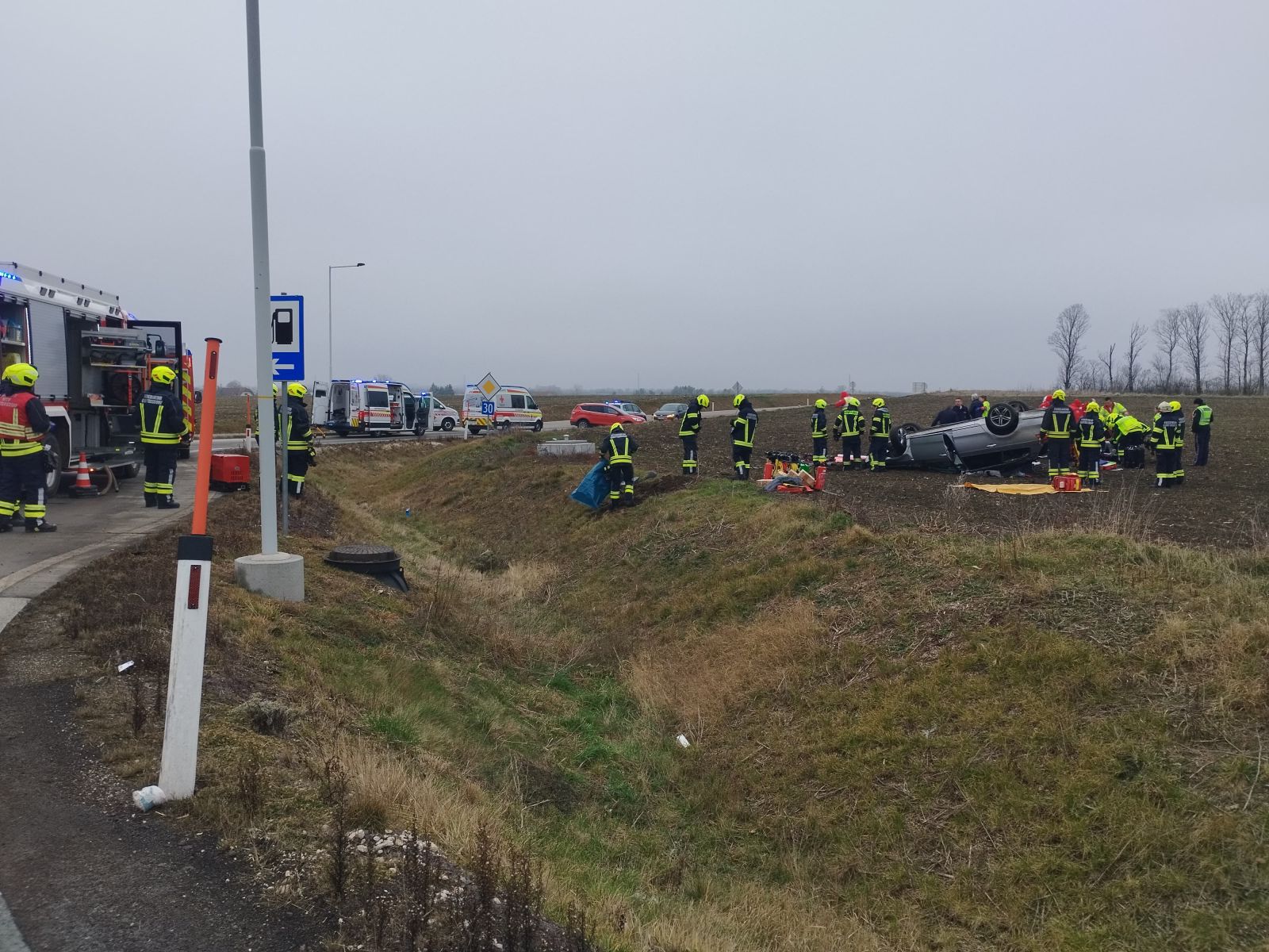 Am Unfallort bestätigte sich die dramatische Lage. Der PKW lag auf dem Dach, und obwohl eine der beiden Insassen das Fahrzeug bereits selbstständig verlassen konnte, blieb der zweite Passagier in dem Fahrzeug eingeklemmt. Die Feuerwehr musste schnell handeln, um den Verletzten aus seiner misslichen Lage zu befreien.