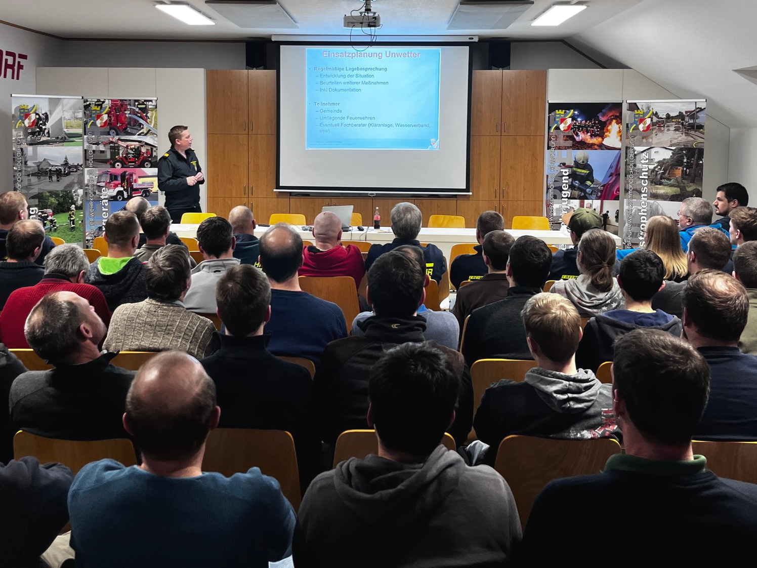 Die Hochwasserkatastrophen im Jahr 2024 lieferten die Motivation für das heurige Thema. Der Fokus lag auf der Abwicklung von Großschadenslagen. Einsatzleitung und Einsatzplanung, Aufgaben und Zusammenarbeit mit den Stäben und Einsatzdokumentation waren dabei nur einige der aufgegriffenen Themen. Die Vortragenden, Abschnittsfeuerwehrkommandant Markus Zahlbrecht und Abschnittsfeuerwehrkommandant-Stv. Christian Holzer, gaben auch einen Einblick in die unterschiedlichen verfügbaren Geräteschaften für den Katastrophenfall.