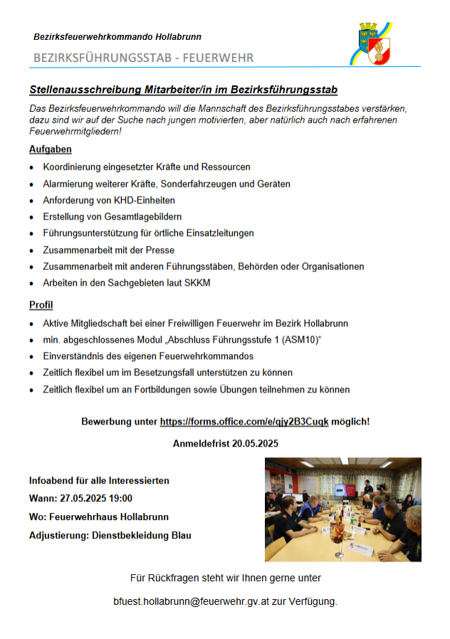 Das Bezirksfeuerwehrkommando Hollabrunn möchte den Bezirksführungsstab verstärken und sucht motivierte Feuerwehrmitglieder – sowohl junge als auch erfahrene Kräfte – die Interesse an einer spannenden und verantwortungsvollen Tätigkeit im Führungsstab haben.