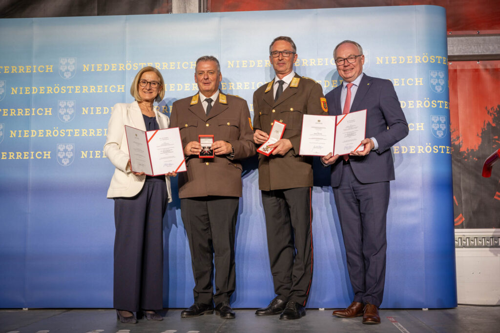 Landeshauptfrau Mikl-Leitner überraschte auch Landesfeuerwehrkommandant Dietmar Fahrafellner und seinen Stellvertreter Martin Boyer mit einer hohen Auszeichnung.