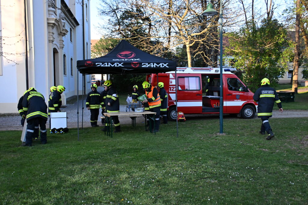 Beim Eintreffen der Feuerwehr Ravelsbach machte sich der Einsatzleiter ein Bild von der Lage im Pfarrhof. Danach gab er seinen Kameraden verschiedenste Befehle. Nach und nach kamen die Feuerwehren des Unterabschnittes zum Übungsort. Es wurde eine Einsatzleitung und einn Atemschutzsammelplatz aufgebaut.