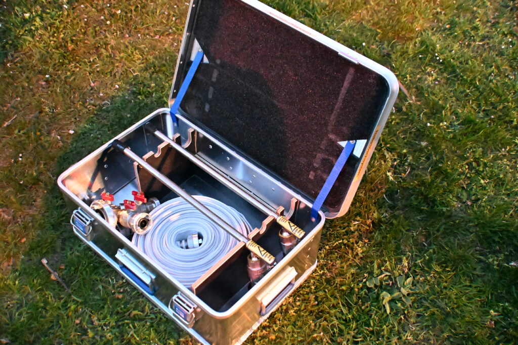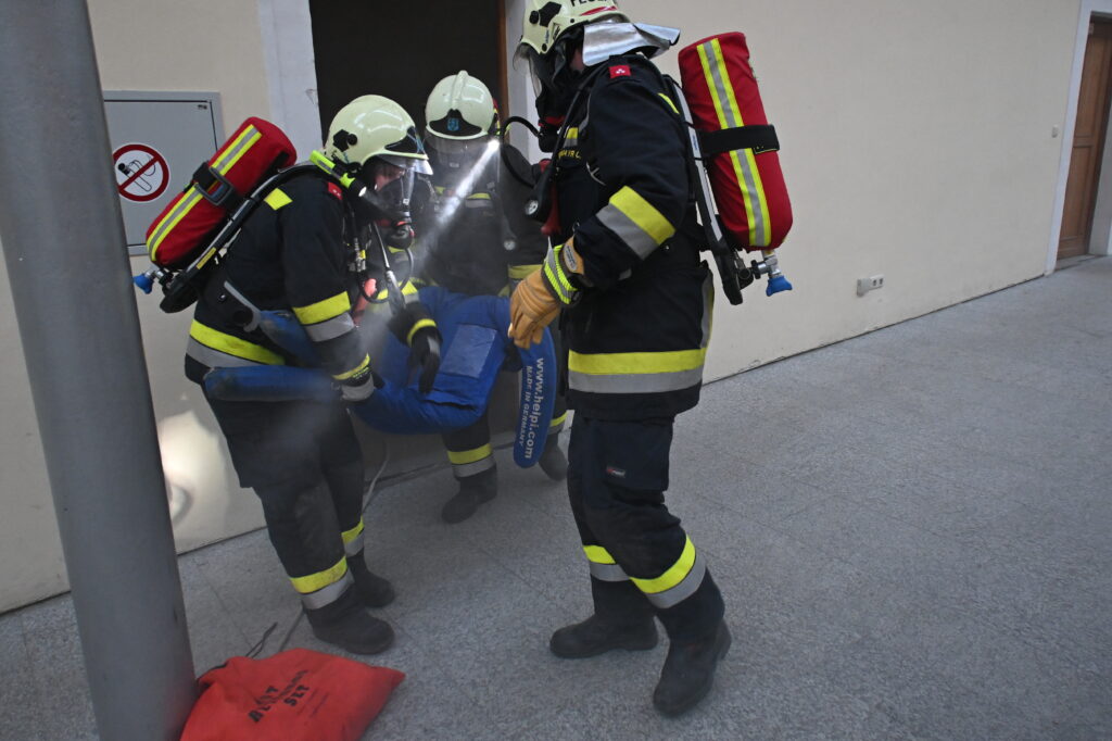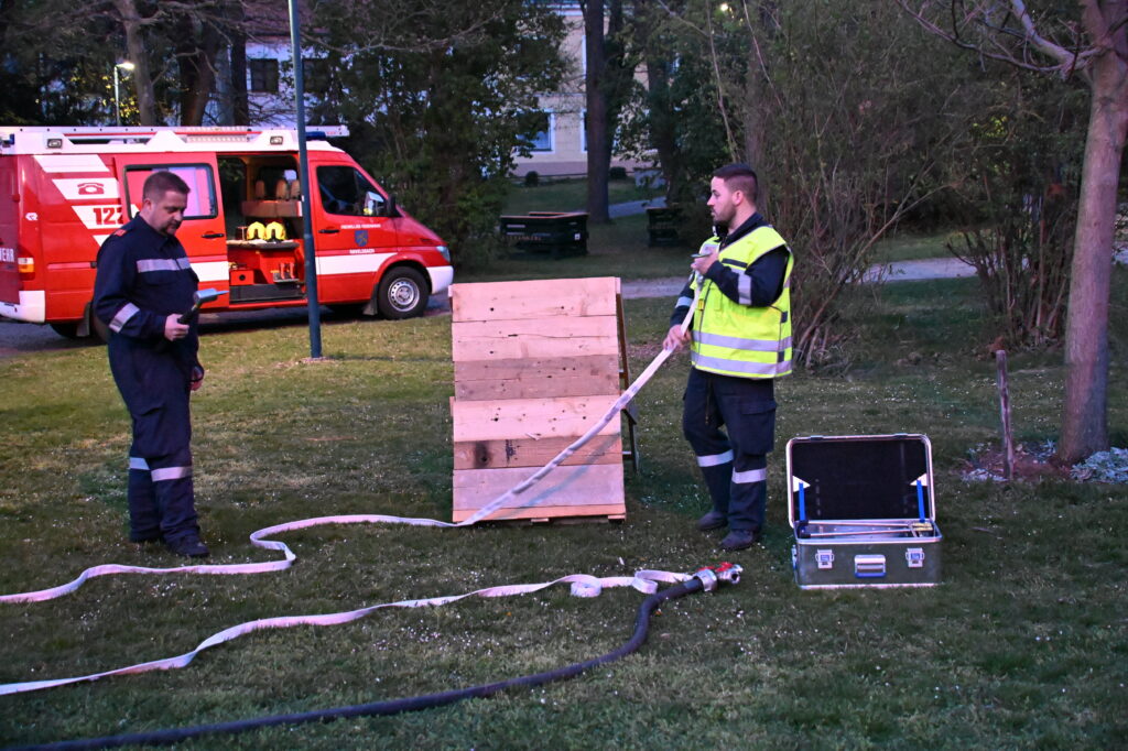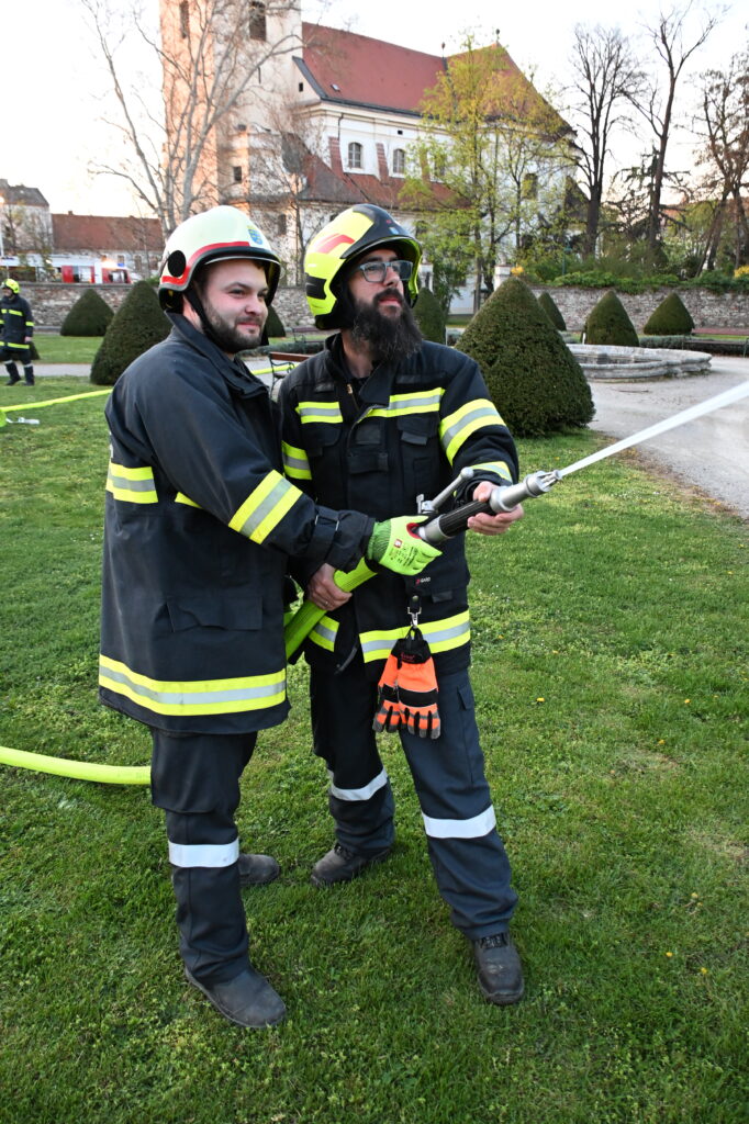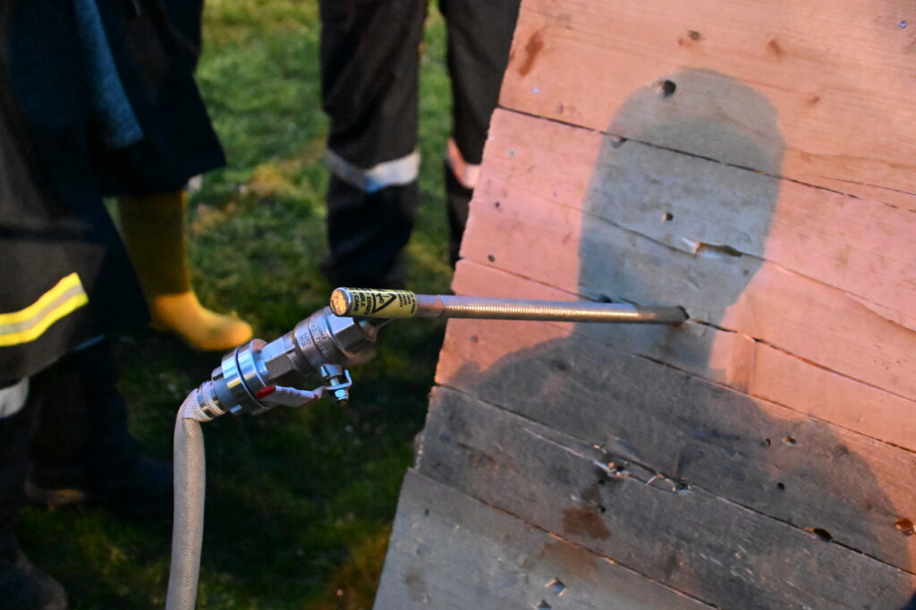 Nach der Übung zeigten BI Elias Grubhofer und EHBI Herbert Widerna das neue Nebellöschsystem „fognail“, welches bei Bränden zum Einsatz kommen kann.