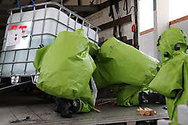 14 Fahrzeuge – 96 Feuerwehrmitglieder In einer Halle wurden Ladearbeiten mittels Stapler durchgeführt. Bei diesen Verladearbeiten wurde ein „IBC Container“ beschädigt. Insgesamt zwei