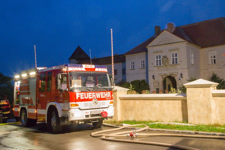 Zimmerbrand im Schloss Mailberg lautet die Übungsannahme am 26.08.2013 für 61 Mitglieder aus 7 verschiedenen Feuerwehren.
