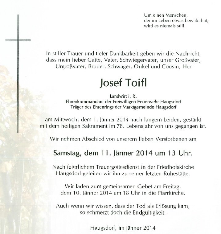 Ehrenkommandant Josef Toifl verstarb am 1. Jänner 2014. Josef Toifl war vom 1971 bis 1993 Kommandant der FF Haugsdorf und