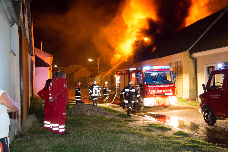 Eine Polizeistreife alarmierte am 17.08.2013 kurz vor Mitternacht die Feuerwehren zu einem Scheunenbrand in Seefeld-Kadolz.