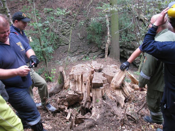 Übungsobjekte waren zwei große Wurzelstöcke im felsigen Untergrund Nähe Pleissing -Waschbach. Durch die Sprengung konnte auch gleichzeitig ein Weg wieder