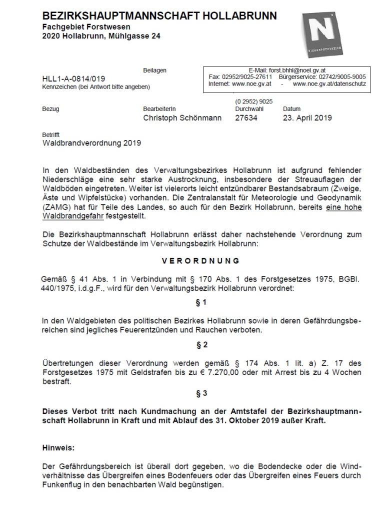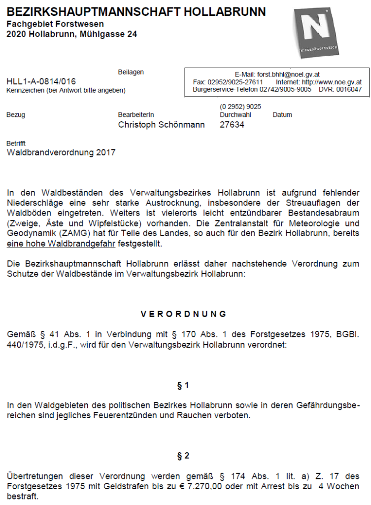 Die Bezirkshauptmannschaft Hollabrunn erlässt daher nachstehende Verordnung zum Schutze der Waldbestände im Verwaltungsbezirk Hollabrunn: In den Waldgebieten des politischen Bezirkes