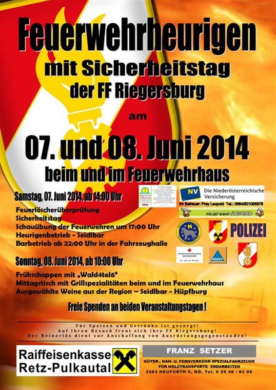 Die Feuerwehr Riegersburg veranstaltet am 07.06.2014 in der Zeit von 14:00 Uhr bis 17:00 Uhr im Rahmen des Feuerwehrfestes einen