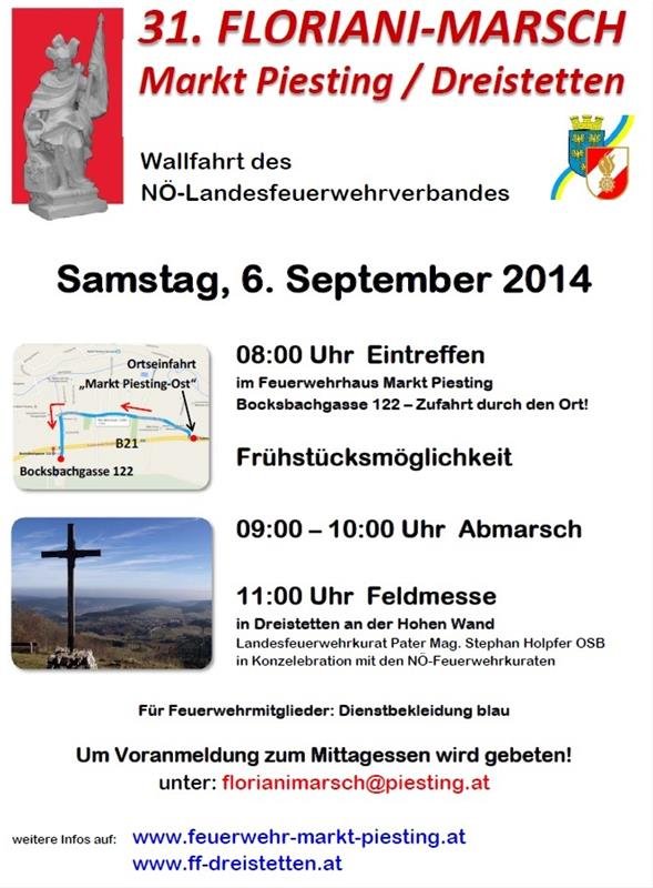 In der Beilage das Plakat für den heurigen Florianimarsch am 6. September 2014, welcher uns in das malerische Dreistetten an