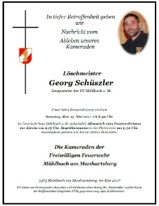 LM Georg Schüszler (1979-2017) – Zeugmeister der Feuerwehr Mühlbach Die FF Mühlbach hat die traurige Pflicht das Ableben von LM