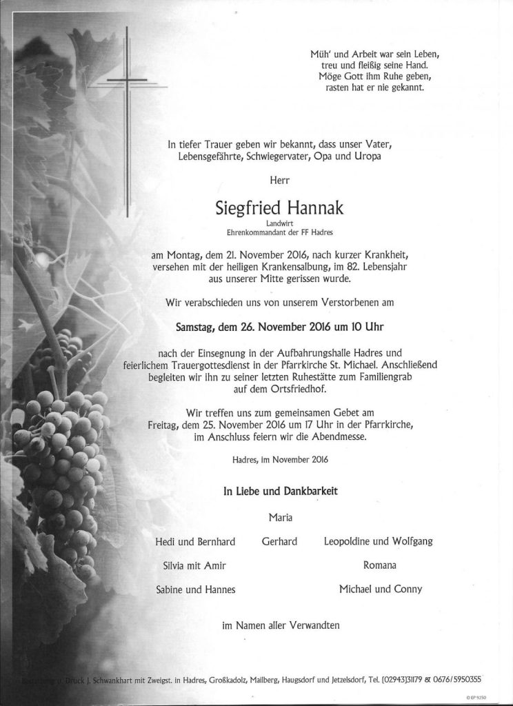 Das AFK Haugsdorf sowie die FF Hadres haben die traurige Pflicht das Ableben von EHBI Siegfried Hannak bekannt zu geben.