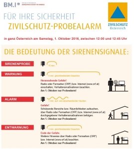 Zivilschutz-Probealarm am 1. Oktober 2016 Am Samstag, 1. Oktober 2016, wird wieder der österreichweite Zivilschutz-Probealarm vom Bundesministerium für Inneres (BM.I)