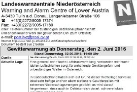 Die Landeswarnzentrale Niederösterreich informiert über die Wetterlage für heute Donnerstag 02.06.2016 und morgen Freitag. Siehe Beilage. Weitere Informationen hier: http://www.feuerwehren-hl.at/donwload-all/category/21-verschiedenes?download=71:unwetterwarnung-02-06-2016