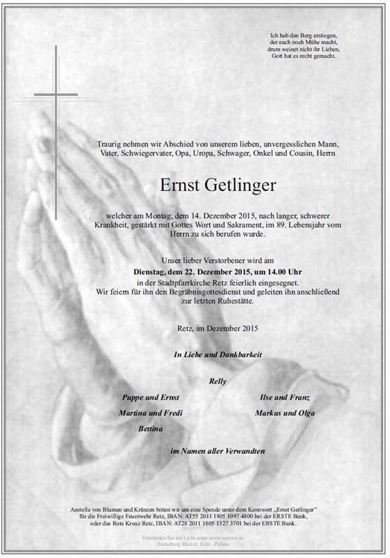 Ernst Getlinger wurde am 22.12.1926 in Retz geboren und trat am 01.01.1959 der Freiwilligen Feuerwehr Retz bei. Von 21.02.1965 bis