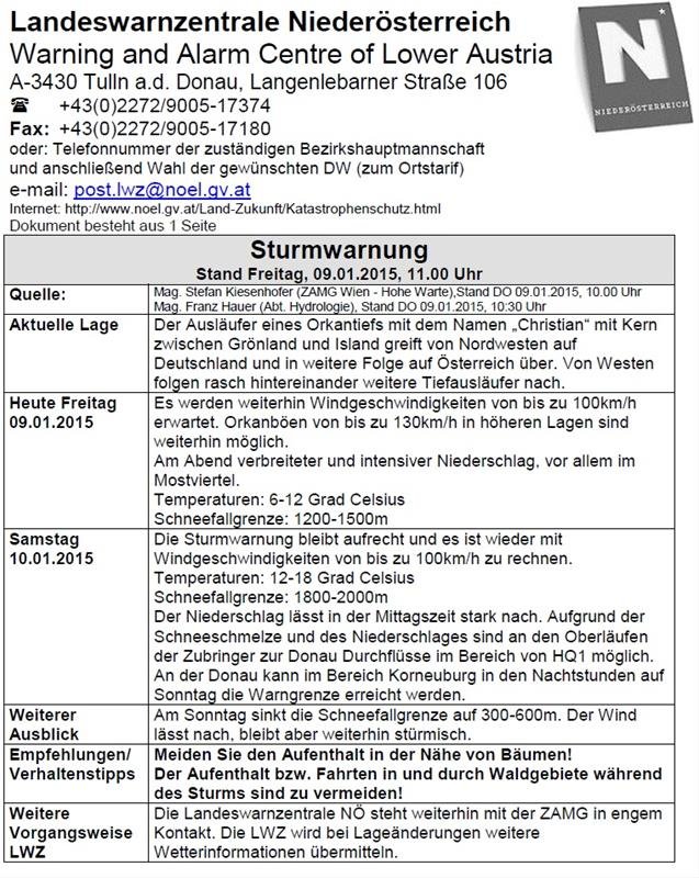 Aufgrund aktueller Wetterprognosen möchten wir informieren, dass ab heute bis inklusive Montag, dem 12. Jänner 2015, mit heftigen Windspitzen bis