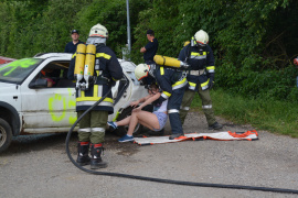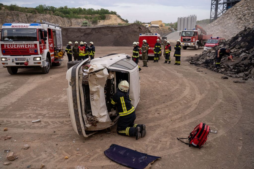 Bei der gestrigen Übung wurde ein Fahrzeug-Überschlag simuliert.Dazu wurde ein Übungsfahrzeug mit zwei Puppen besetzt und im Steinbruch der Firma