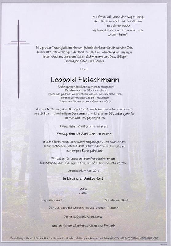 Die Feuerwehr Jetzelsdorf muss in tiefer Trauer das Ableben ihres Kameraden EHV Leopold Fleischmann bekannt geben.