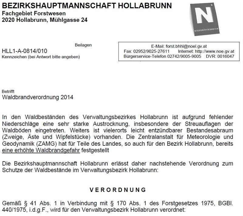 In den Waldbeständen des Verwaltungsbezirkes Hollabrunn ist aufgrund fehlender Niederschläge eine sehr starke Austrocknung, insbesondere der Streuauflagen der Waldböden eingetreten.