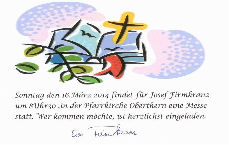 Am Sonntag, 16. März 2014 findet in der Pfarrkirche Oberthern um 8.30 Uhr für Josef Firmkranz eine Messe statt. Wer […]
